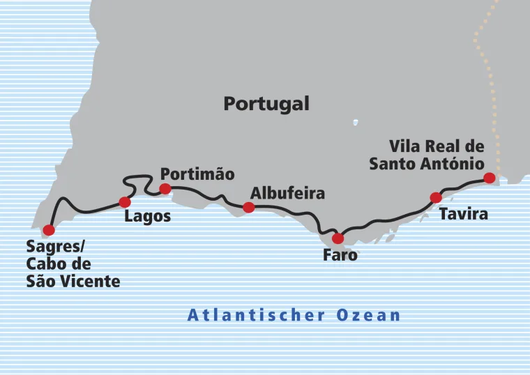 Sie starten Ihre Veloreise neben dem Leuchtturm am Kap St. Vincent, dem südwestlichsten Punkt Kontinentaleuropas. Auf ruhigen Strassen radeln Sie durch Vila do Bispo und durch Raposeira, wo Sie historische Kirchen und traditionelle Cafés besuchen können. Weiter fahren Sie auf Nebenstrassen durch grüne Felder und sanfte Hügel, bis Sie die Küste erreichen und vom Meer begrüsst werden. Sie passieren verschiedene Fischerdörfer und interessante Ruinen, welche zu einer Pause einladen. Auf einem Veloweg mit Blick auf das Meer und die Steilküste passieren Sie Ponta da Piedade, wo Sie das herrliche Naturdenkmal erkunden, bevor es weiter fahren in das Stadtzentrum von Lagos.