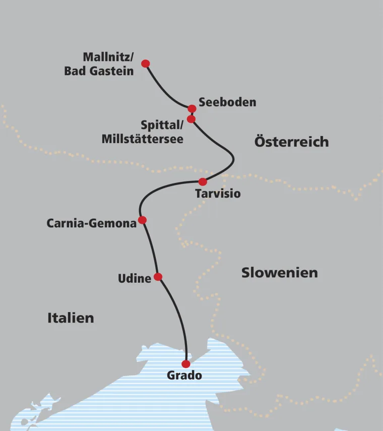 Der Alpe Adria Radweg ist ein Fernradweg durch eine kontrastreiche Landschaft bis zum Adriatischen Meer. Mallnitz eignet sich ideal als Start für eine gemütliche Radtour von Österreich ans Meer. Von Mallnitz geht es in die Seitentäler des Nationalparks Tauern zum Naturschutzgebiet Stappitzersee und den 5 Wasserfällen, einem einzigartigen Naturjuwel der Alpen. Die Strecke folgt weiter der Möll, Drau bis Villach und Gail, vorbei an Seen wie dem Millstättersee und dem Faakersee. In Italien wird von Tarvis auf den ehemaligen Trassen der alten K+K-Bahn durch das enge Tal des Fella-Flusses und entlang des Tagliamento-Flusses bis Udine geradelt. Durch romantische Dörfer wie Pavia geht es nach Palmanova, einem venezianischen Festungsstädchen (16. Jhdt.) mit Piazza Grande und erhaltener Stadtmauer und nach Aquileia, der römischen Kaiserresidenz (UNESCO-Welterbe). Landschaftlich beeindruckend erreicht man durch die Lagune das Hafenstädtchen Grado. Der Alpe-Adria-Radweg ermöglicht nicht nur die Erkundung von Natur und Kultur, sondern auch die kulinarische Vielfalt der unterschiedlichen Regionen.
