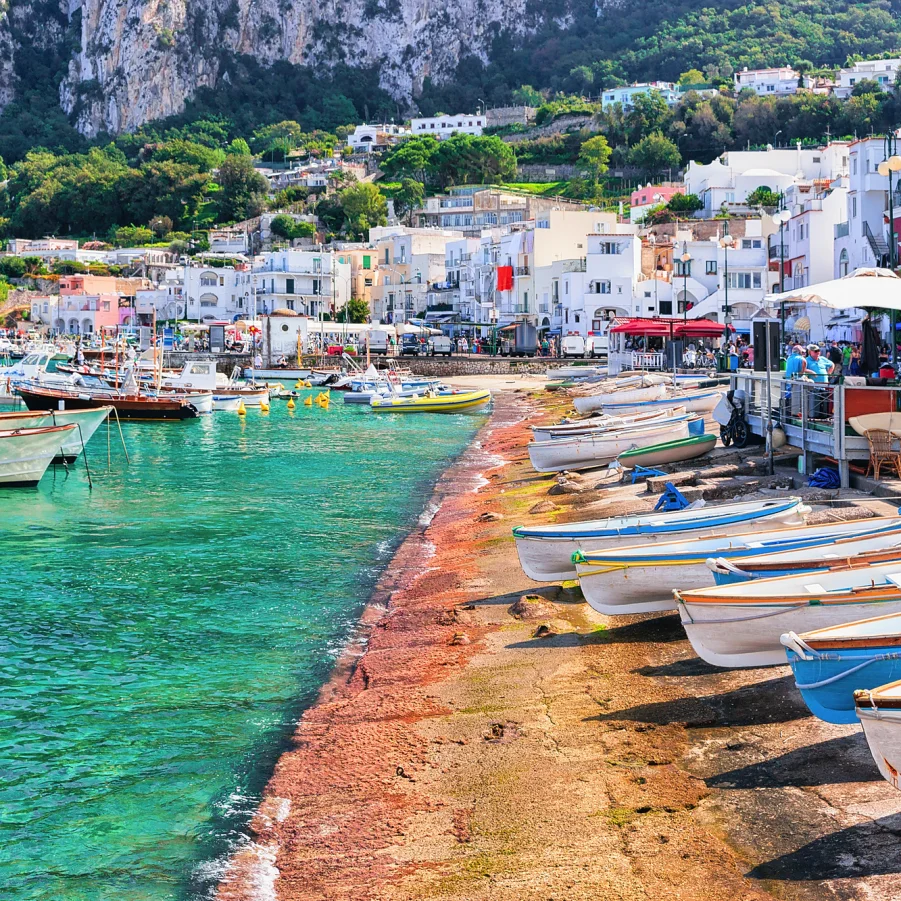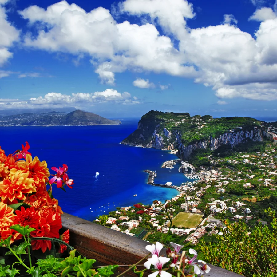 Bootsfahrt zur berühmten Insel Capri. Wir schlendern durch verwinkelte Gassen und blühende Gärten zu beeindruckenden Aussichtspunkten. Danach bleibt Zeit für einen Espresso oder einen Bummel. → Wz 2 Std.