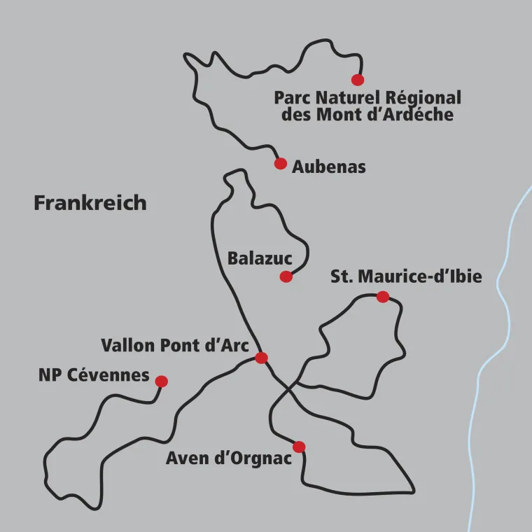 Wir starten unsere Veloreise mit einer Rundtour direkt ab unserem Hotel. Unser Weg führt durch das wunderschöne Vallé de l'Ibie bis nach St. Maurice-d'Ibie. Dieses Tal hat die Besonderheit, dass das Flussbett nur während der Regenzeit oberflächlich Wasser führt. Der Hauptstrom fliesst jedoch ganzjährig bis zu 10m unterhalb des Kiesbetts. So bleibt das Tal selbst in den heissesten Sommern immer grün - eine geografische Besonderheit! Anschliessend nehmen wir den Anstieg zum Collet de la Serre in Angriff. Weiter geht es auf hügeligem Gelände durch Weinberge und über Saint-Remèze zurück nach Vallon Pont d'Arc.