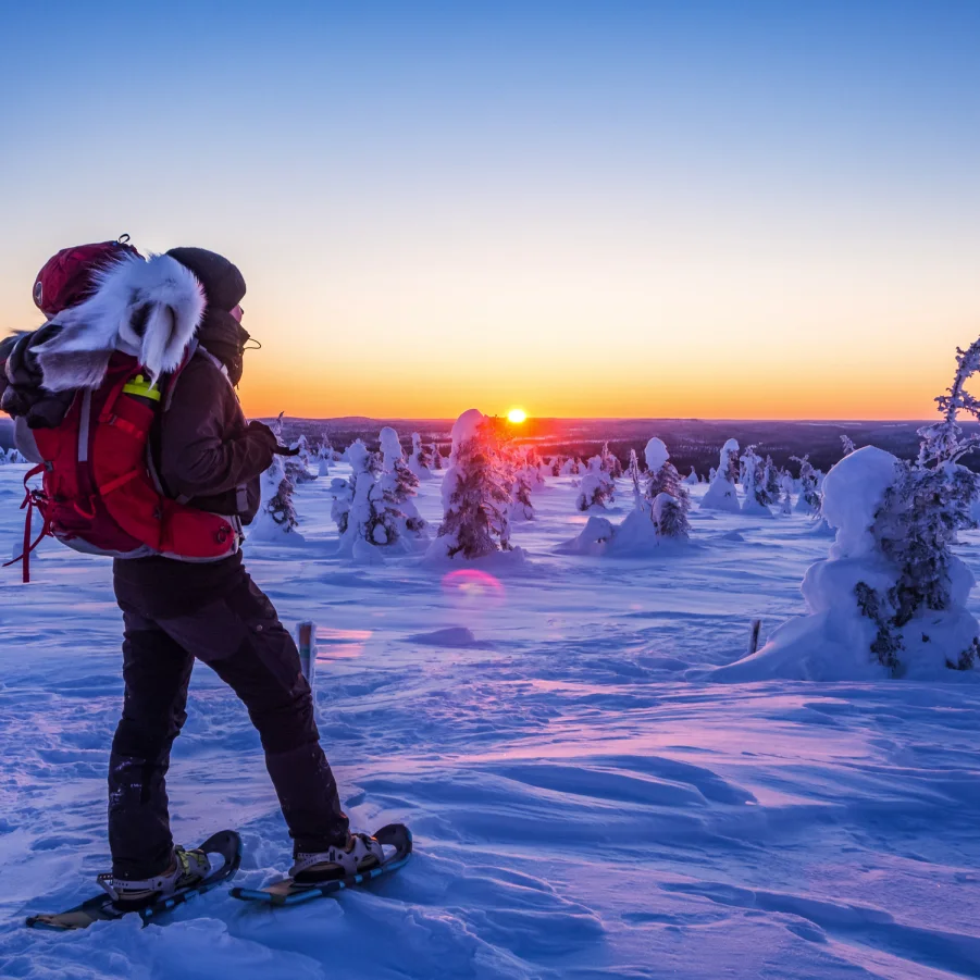 Mit Schneeschuhen erkunden wir eine der schönsten Gegenden in der Region Ruka. Wir wandern durch den winterlichen Wald, hinauf zum Valtavaara-Hügel, von dem aus sich ein wunderschöner Blick über die Region eröffnet. Um uns aufzuwärmen, trinken wir Tee oder Kaffee am offenen Feuer. → Wz 2½ Std.