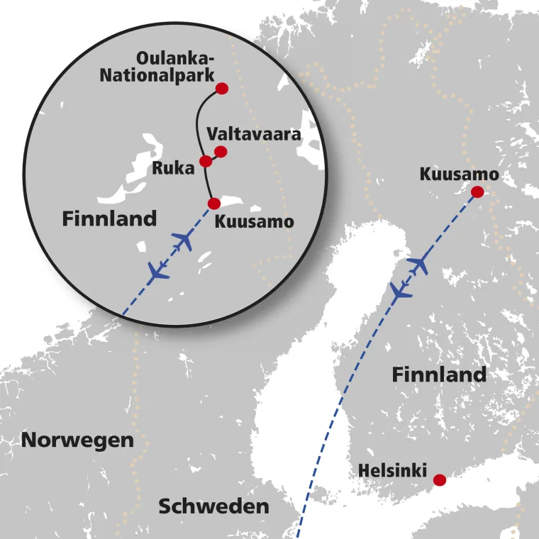 Nach feinem Brunch Transfer zum Flughafen Kuusamo und Rückflug nach Zürich oder individuelle Verlängerung.