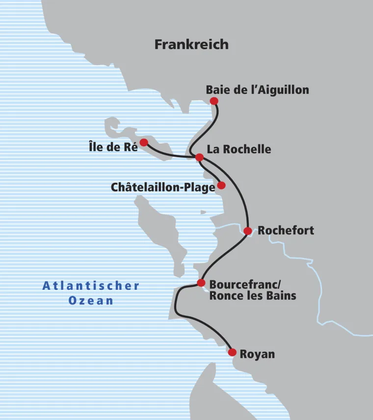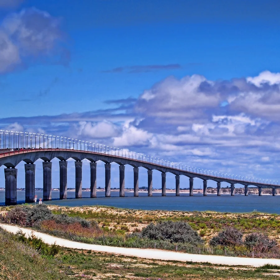 Der heutige Velotag beginnt mit der bemerkenswerten Fahrt über die Brücke der Insel Ré. Ein unvergessliches Erlebnis. Durch die malerischen Fischerorte Rivedoux und La Flotte, mit kurzem Halt auf dem farbenfrohen Markt, führt der Veloweg in die quirlige Hafenstadt Saint Martin. Viele einladende Badestrände bereichern den Tag, bevor die Etappe wieder über die Brücke zurück auf dem Veloweg nach La Rochelle führt.