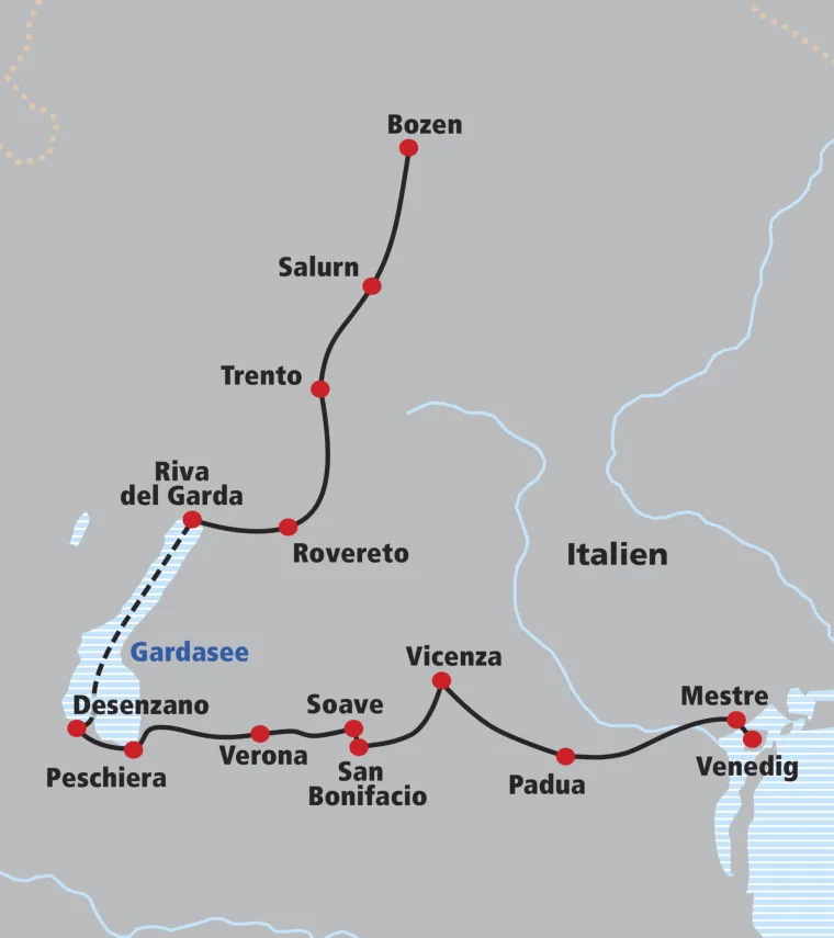 Heute fahren Sie auf dem Radweg am Ufer der Etsch entlang, vorbei an den berühmten Obstgärten und Weinbergen des Unterlandes. Auf halbem Weg zwischen Bozen und Trient treffen Sie auf Salurn, der Sprachgrenze zwischen dem deutschsprachigen und dem italienischsprachigen Gebiet Norditaliens. Man kann mit dem Zug in mehreren Bahnhöfen die Etappe verkürzen.