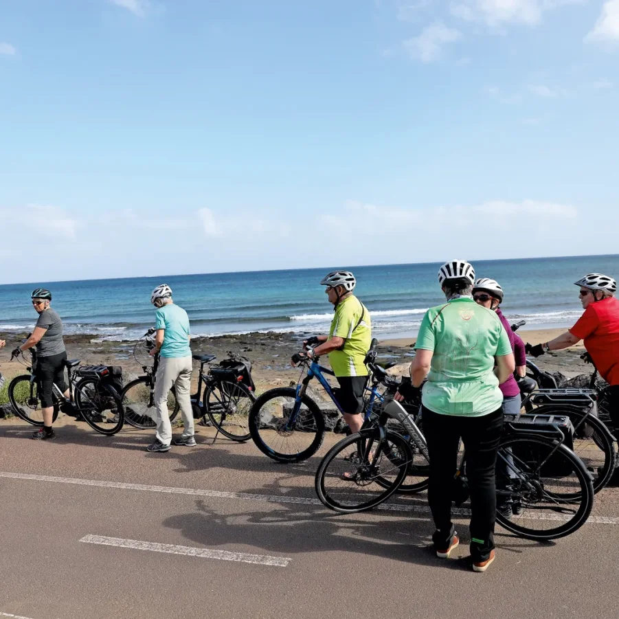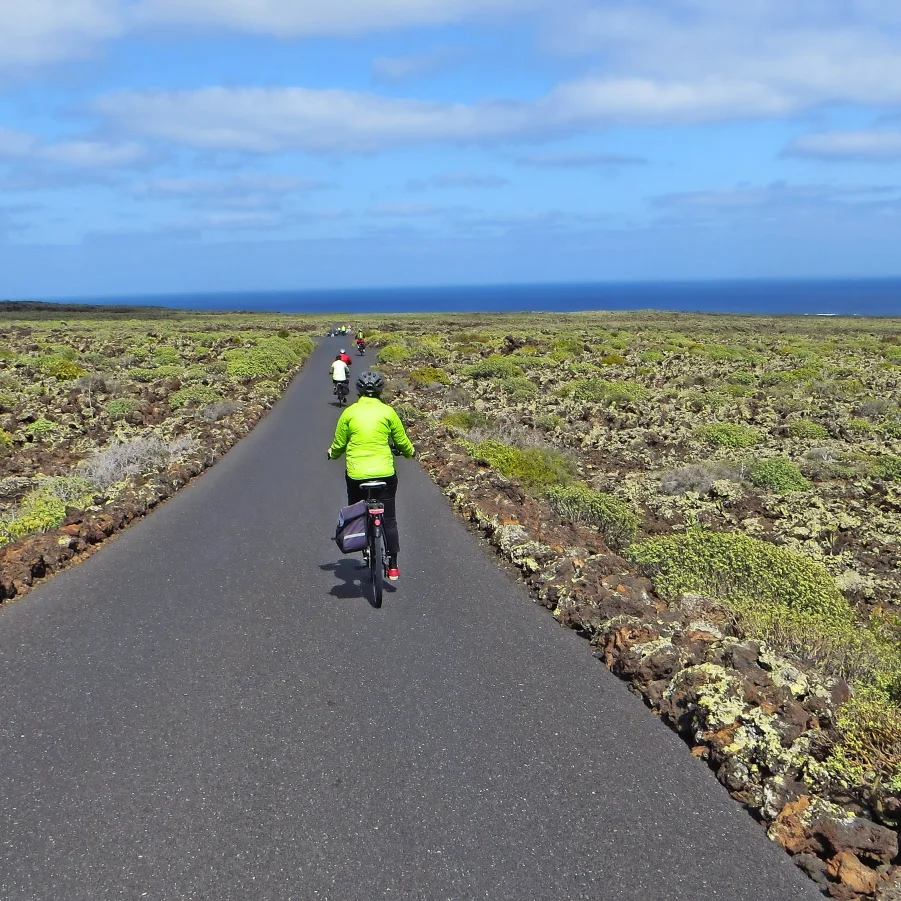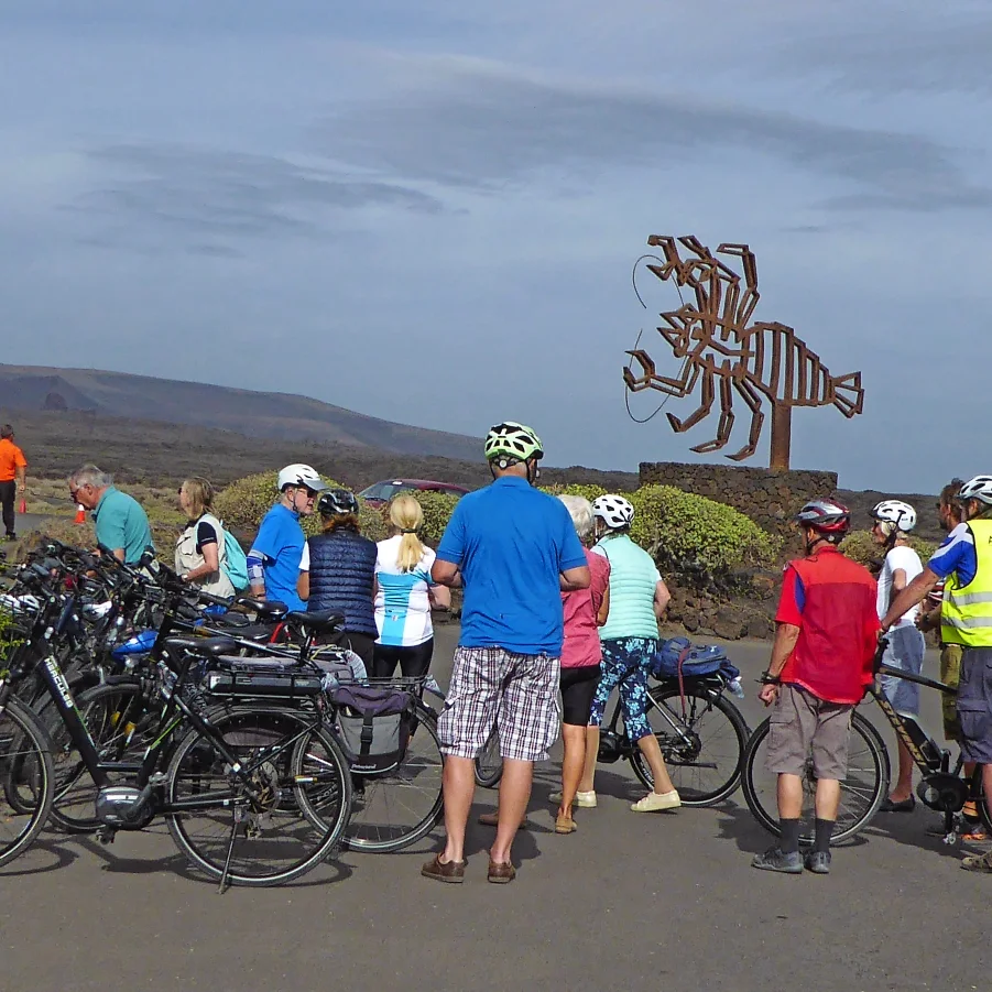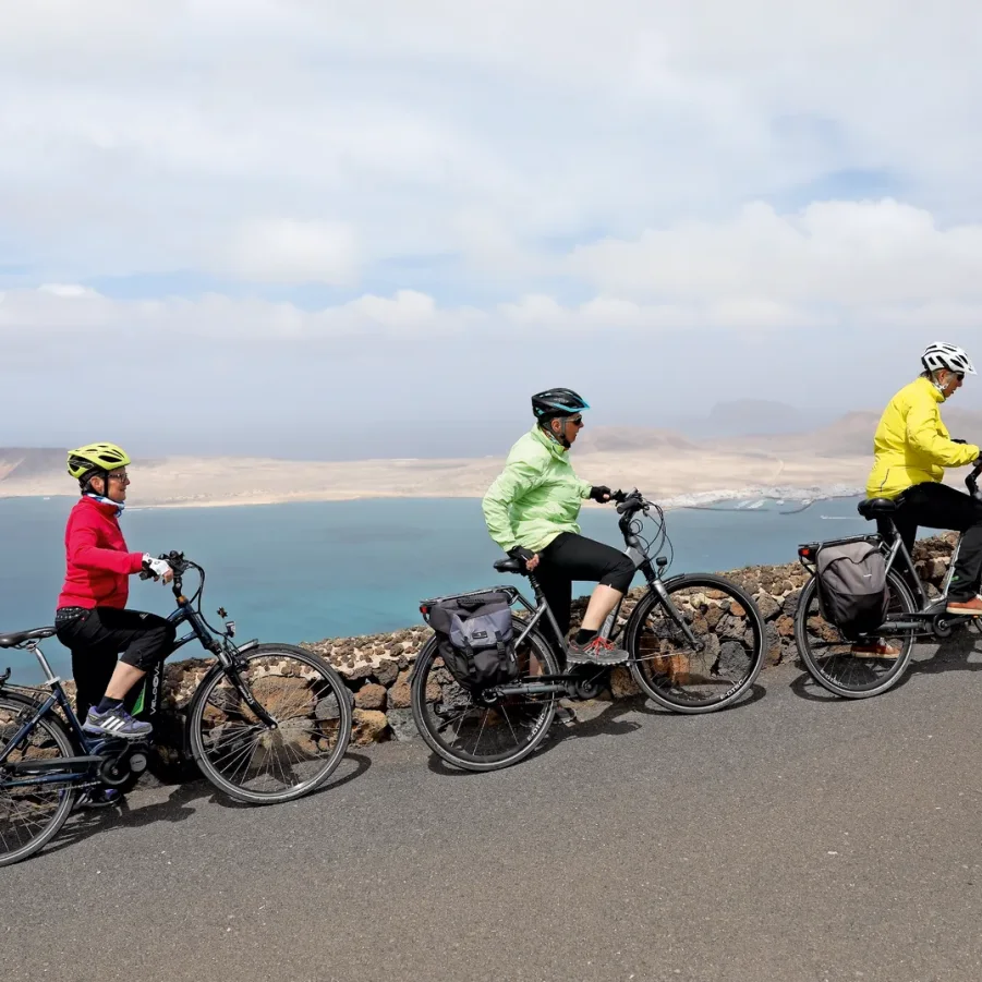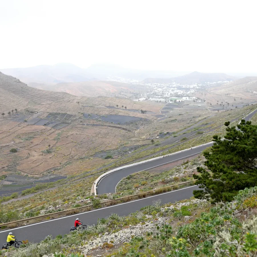 Kurzer Bustransfer. In luftiger Höhe satteln wir um und fahren mit den E-Bikes die kurvige Passstrasse hinunter nach Haria. Dort besuchen wir die Casa de Cesar Manrique, das letzte Wohnhaus von C.M. Die hügelige Topografie belohnt immer wieder mit einzigartigen Ausblicken. Auf der Fahrt zum Mirador del Rio überrascht die herrliche Aussicht auf die Nachbarinsel La Graciosa. Flotte Abfahrten führen uns nach Orzola zu unserem Mittagshalt. Nach kurzweiliger Fahrt tauchen wir ein in die Lavablasen, die «Jameos». Der Künstler Cesar Manrique erschuf ein faszinierendes Naturkunstwerk.