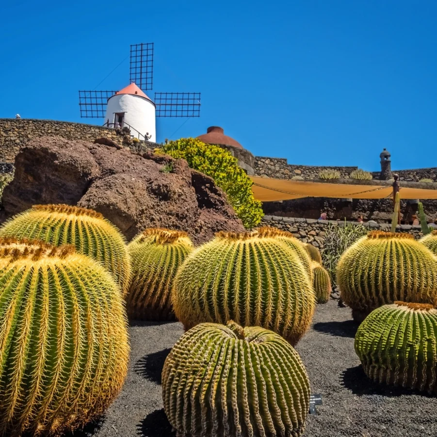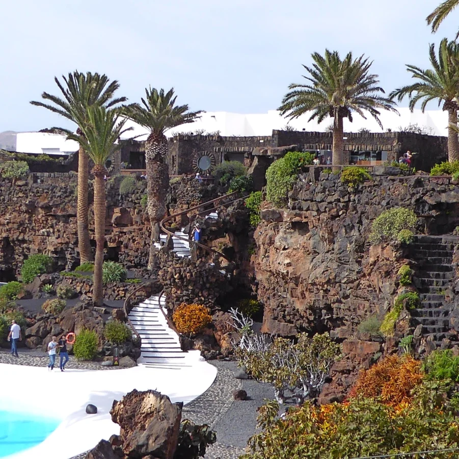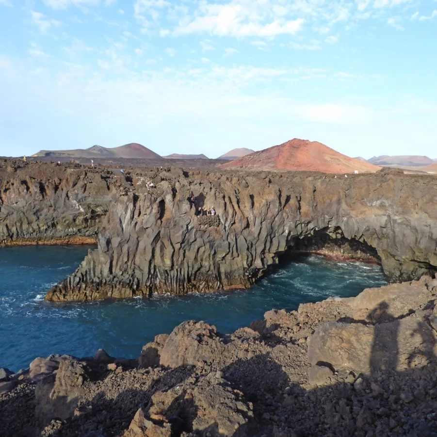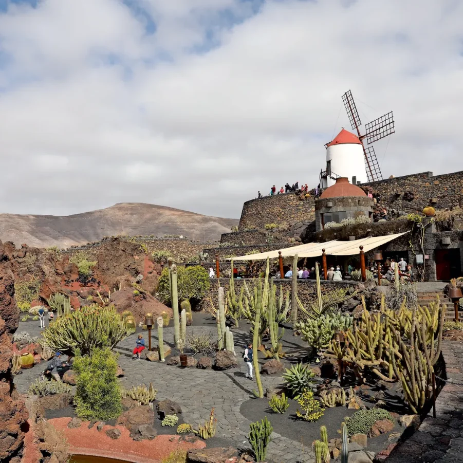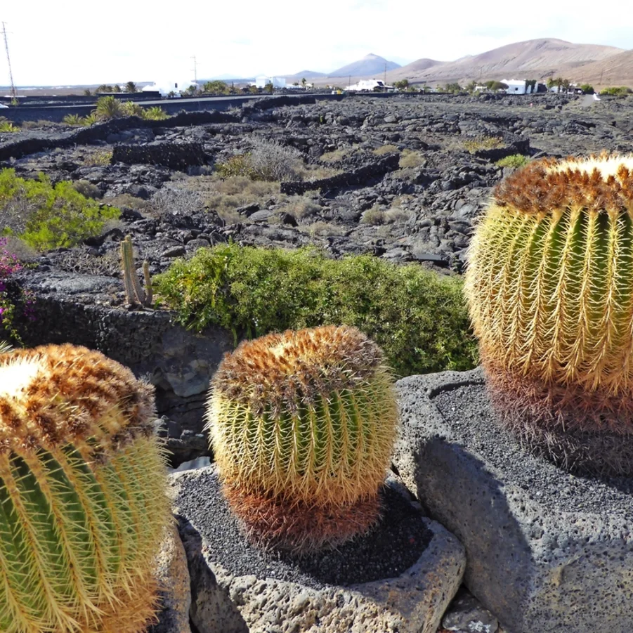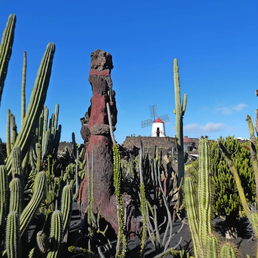 Wir fahren nach Guatiza, wo wir den wunderschönen Jardin de Cactus besuchen. Dieser 1990 eröffnete Garten war das letzte touristische Werk des grossartigen Künstlers und Architekten César Manrique. In einem ehemaligen Steinbruch von 5000 m² wachsen die verschiedensten Kakteen: 4500 Exemplare von 450 verschiedenen Arten aus fünf Kontinenten! Danach gelangen wir zu den Cueva de los Verdes, einem über 7 km langen Lavatunnel, ausgehend vom Vulkan Monte Corona an der Nordspitze Lanzarotes bis zum Meer. In dieser speziellen Höhle kann man die Bestandteile des Lavagesteins sehen: weisses Kalziumkarbonat, rötliches Eisen, schwarzes Magnesium und gelblicher Phosphor.