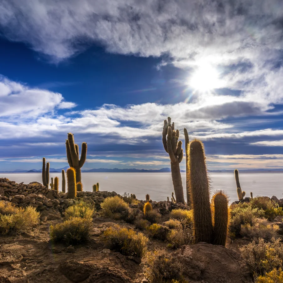 Flug nach Uyuni und Fahrt zur Isla Incahuasi. Diese eindrückliche Insel mit den Riesenkakteen befindet sich in der Mitte des Salzmeeres. Danach Weiterfahrt zu unserem Salzhotel. → Wz 1 Std.