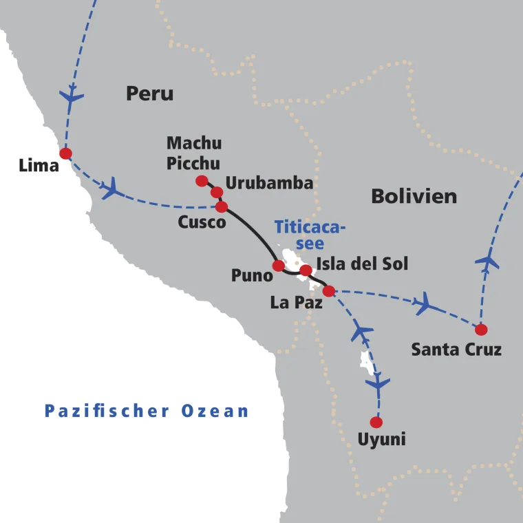 Überquerung der Grenze nach Bolivien und Bootsfahrt zur Sonneninsel. Fantastische Sonnenauf- und untergänge sowie Kultstätten begegnen uns auf der Insel. → Wz 4 Std.