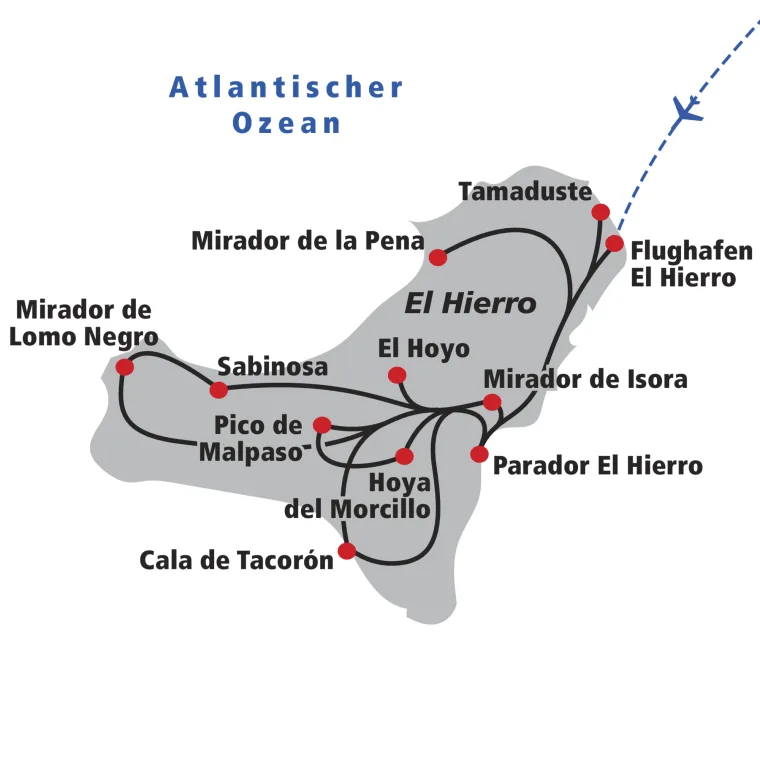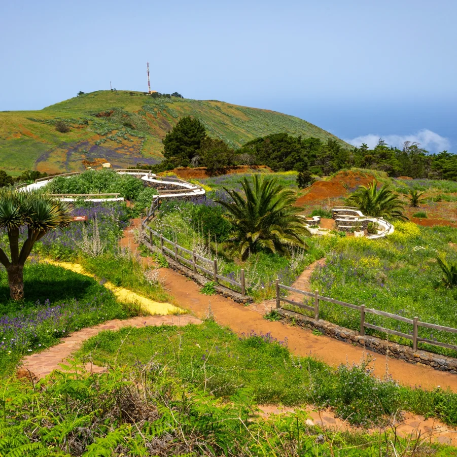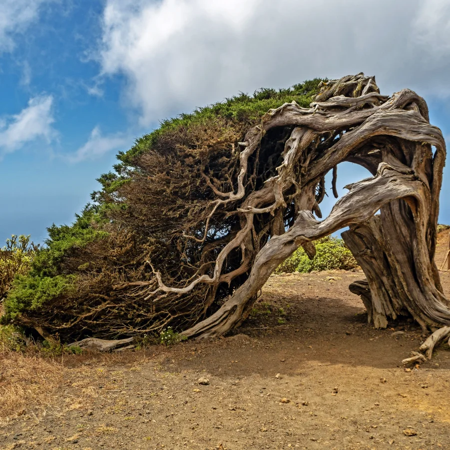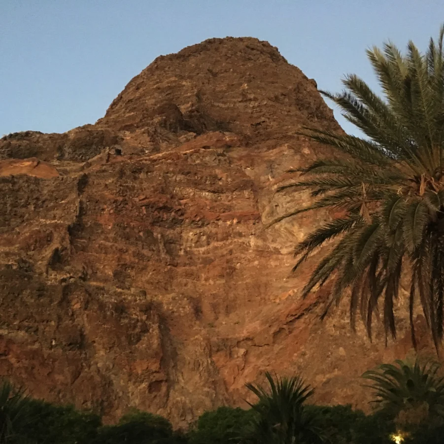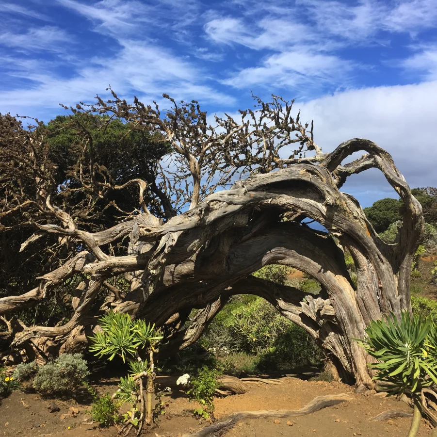 Nach dem Aufstieg wandern wir bergab entlang des Bergkammes zum Aussichtspunkt Mirador de Lomo negro. Wir begegnen den ältesten Kanarischen Wachholderbäumen, die von Passatwinden zu richtigen Skulpturen geformt wurden. Auf dem Rückweg lohnt sich ein Besuch des Küstenweges bei La Maceta. Mit dem Ausblick auf La Palma geniessen wir ein landestypisches Nachtessen im Bergdorf Guarazoca. → Wz 4 ½ Std.