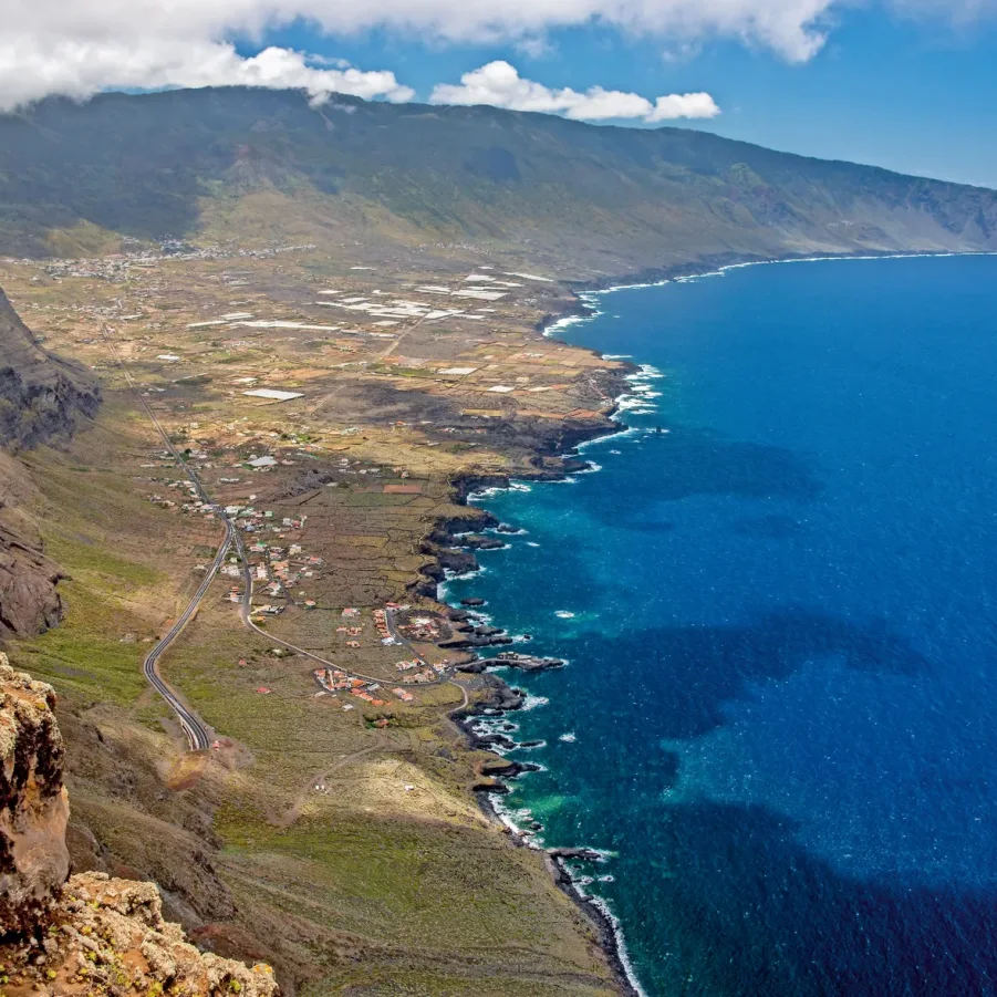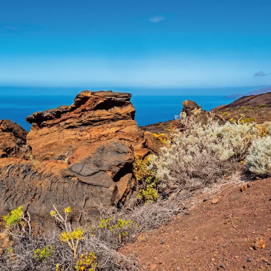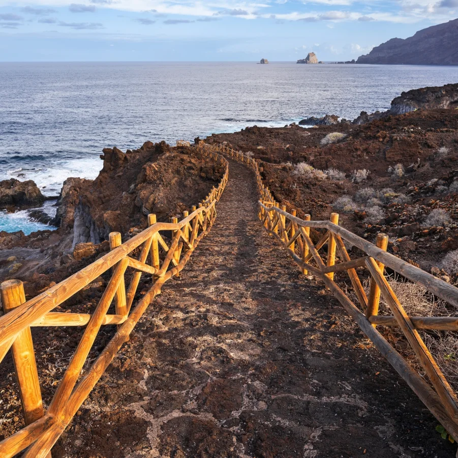 Wir fahren vom Hotel ins malerische Bergdorf El Pinar. Kurz nach dem Start verlassen wir bergabwärts das bekannte Weinanbaugebiet und wandern durch eine steinige, aber faszinierende Vulkanlandschaft bis zum Meer, wo uns ein Meerwasser-Schwimmbecken zum Baden einlädt. Auf dem Rückweg geniessen wir die Atmosphäre am Hafen von La Restinga. → Wz 5 Std.
