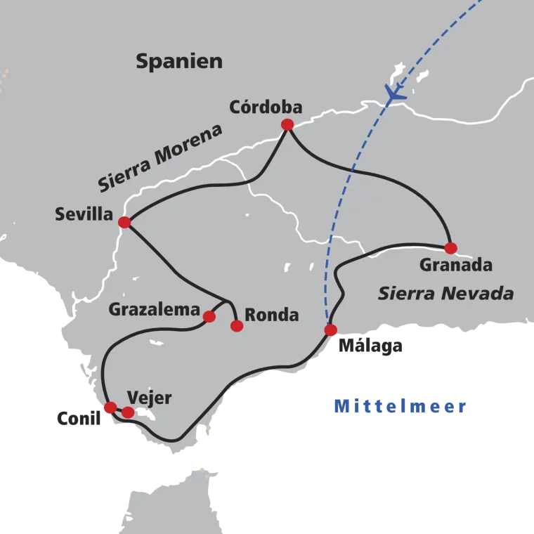 Flug von Zürich nach Málaga und Transfer nach Granada.