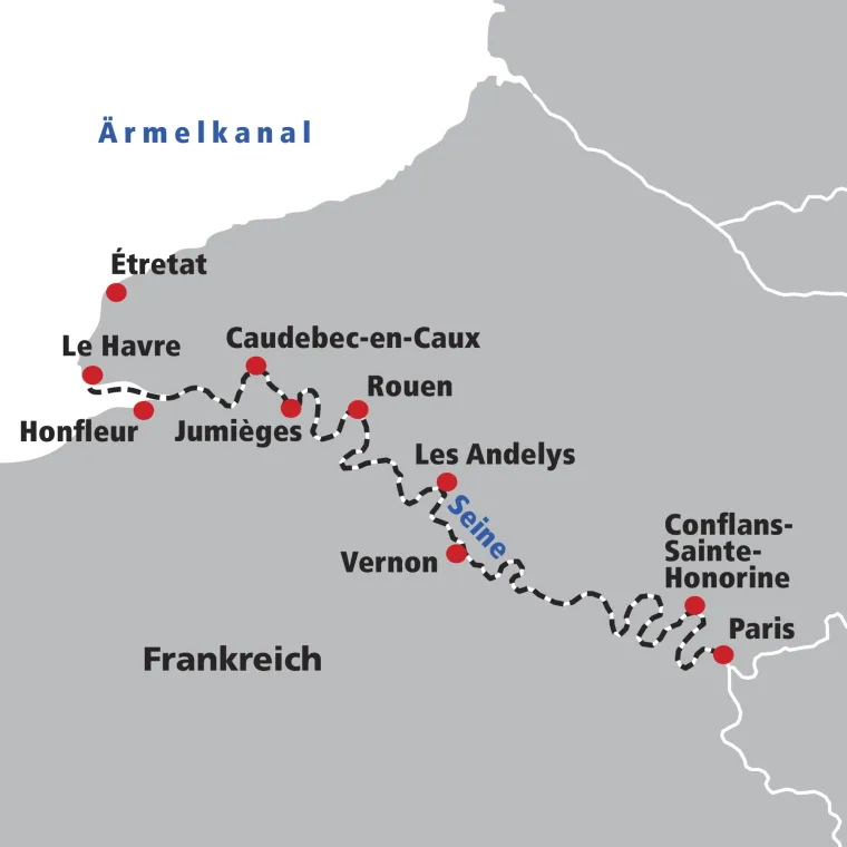 Draussen duftet es nach weiter Welt, und in Ihnen erwacht Neugier. Nachts haben wir Le Havre an der Seine-Mündung in den Ärmelkanal erreicht. Hier starten zwei Ausflüge der Kontraste. Zuerst öffnet das Hafenstädtchen Honfleur seine Schatzkammer. Das „Juwel der Blumenküste“ verführte schon Maler wie Monet und Corbin. Das changierende Licht am alten Hafen, die engen Gassen mit Künstlerateliers, die kleinen Cafés… Am Nachmittag brechen Sie zur „Alabasterküste“ auf. Ihr Spaziergang auf den Klippenpfaden der bizarren Kreidefelsen von Étretat bietet beste Aussichten, um unvergesslich zu bleiben. Eine Chanson-Darbietung an Bord sorgt für den passenden Tagesabschluss.
