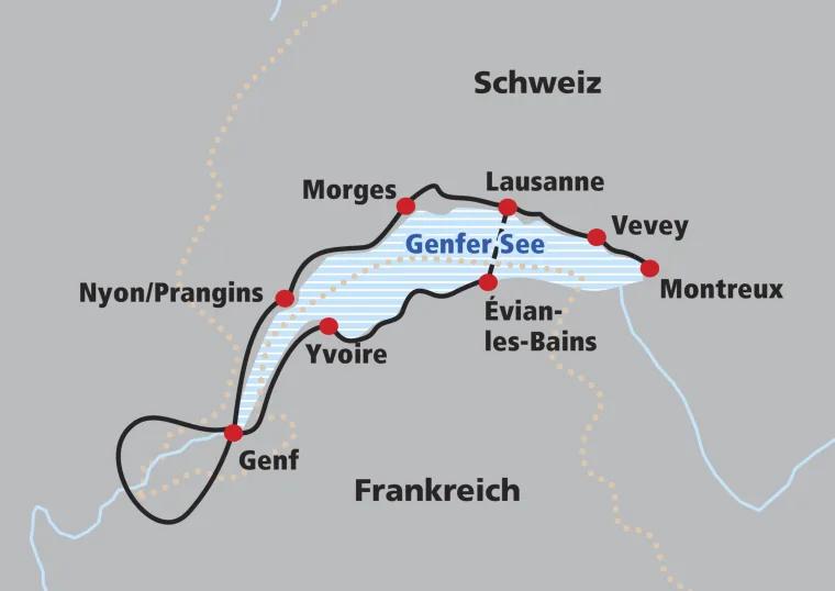 Malerische Häfen und charmante Dörfer erwarten Sie bei der Fahrt zur Schweizer Grenze. Kurz nach dem Grenzübertritt passieren Sie das Dorf Hermance. In Cologny erblicken Sie ein erstes Mal den Jet d’Eau, der Sie nach Genf führen wird.