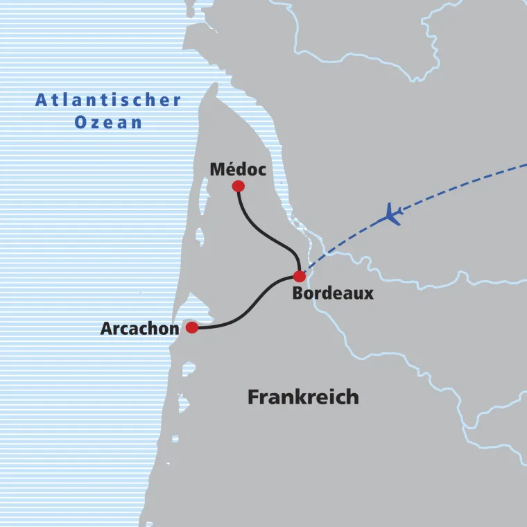 Der Bus bringt uns am Morgen nach Arcachon. Auf einer Bootsrundfahrt erfahren wir viel Interessantes von dieser faszinierenden Region. Wir sehen die Ile des Oiseaux, die Austernbänke und die idyllischen Fischerdörfer entlang des Landstreifens nach Cap Ferret. Danach bringt uns der Bus zu den Dünen von Pilat, die wir über eine Treppe besteigen. Was für eine traumhafte Sicht über Meer und Wälder erwartet uns oben. Der krönende Abschluss dieses Ausfluges ist der Besuch des Austern Museums in Gujan-Mestras. Natürlich darf eine Verkostung dieser typischen Spezialität nicht fehlen. Ein weiteres exquisites Abendessen erwartet uns in Bordeaux. → Wz 1 Std.