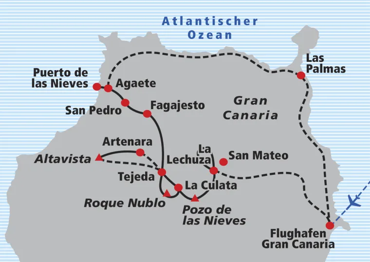 Der Aufstieg zum Altavista-Gipfel (auf 1378 m) am Rande des Naturparks Tamadaba ist einfach, aber interessant, da er tolle Ausblicke über Gran Canaria, Teneriffa und El Teide, den höchsten Gipfel Spaniens, ermöglicht. Sie werden morgens zum Pass Degalloda del Sargenta gebracht und am Ende der Wanderung in Artenara abgeholt, wo Sie auf das Taxi warten können, während Sie auf einer Terrasse einen Drink oder ein Mittagessen geniessen. Wer die Wanderung verkürzen möchte, sollte sich vom Fahrer am Startpunkt abholen lassen und dies vor Ort bezahlen.