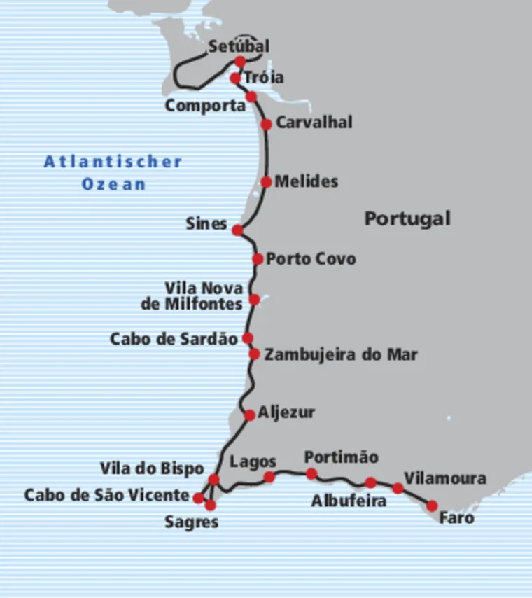 Heute beginnen Sie Ihre Tour in Setúbal und setzen mit der Fähre über auf die ruhige Halbinsel Tróia. Von Tróia aus geht es weiter in den Süden nach Comporta, das für seinen entspannten Charme und die unberührten Strände bekannt ist. Sie fahren vorbei an Reisfeldern und Weinbergen und gelangen über Melides – einem malerischen Dorf inmitten dichter Korkeichenwälder – nach Santiago do Cacém, das mit seinem mittelalterlichen Schloss und den römischen Ruinen beeindruckt. Anschliessend führt die Route weiter nach Porto Covo, einem idyllischen Fischerdorf mit Kopfsteinpflasterstrassen und strahlend weissen Häusern, wo hohe Klippen spektakuläre Ausblicke auf den Atlantik bieten. Der letzte Abschnitt des Tages endet in Vila Nova de Milfontes am Mira-Fluss, berühmt für seine beeindruckenden Fluss- und Meereslandschaften sowie das charmante historische Zentrum.