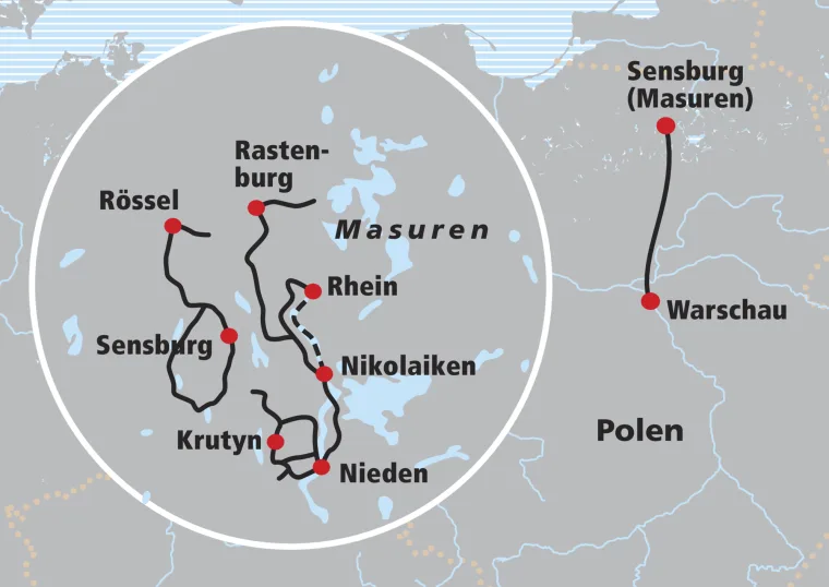 Die heutige Velotour führt Sie an den Masurischen Seen entlang rund um Nikolaiken. Am Vormittag Schifffahrt von Mikołajki nach Ryn. Es erwartet Sie eine wunderschöne Landschaft auf dem nördlichen Teil des längsten Rinnensees in Polen. Sie beenden die Fahrt am Fusse der historischen Kreuzritterburg in Ryn/Rhein. Am Nachmittag unternehmen Sie eine Velotour an malerischen Dörfern und den Masurischen Kanälen vorbei. Entspannen Sie am Nachmittag in Nikolaiken. Stadtbummel und Kaffeepause.
