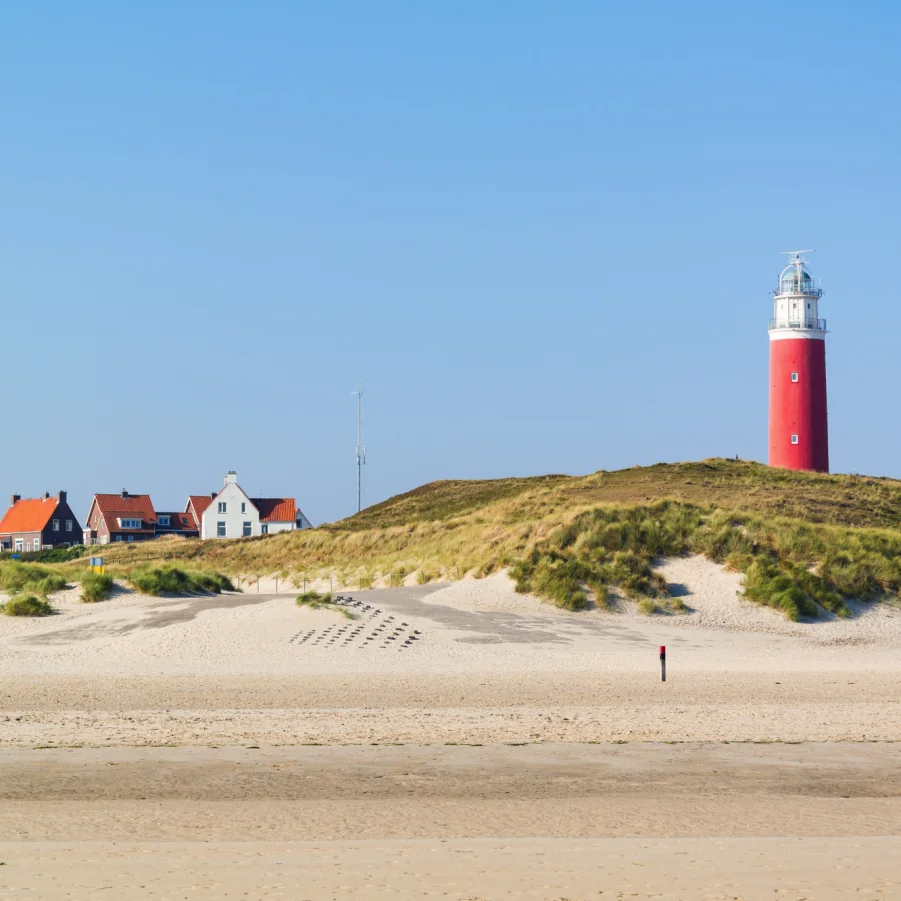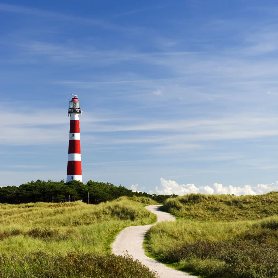 Grüne Dünen und weisser Sandstrand laden zu Wanderungen ein. Vom 55 m hohen Leuchtturm bietet sich ein herrlicher Ausblick.→ Wz 2 - 2½ Std.