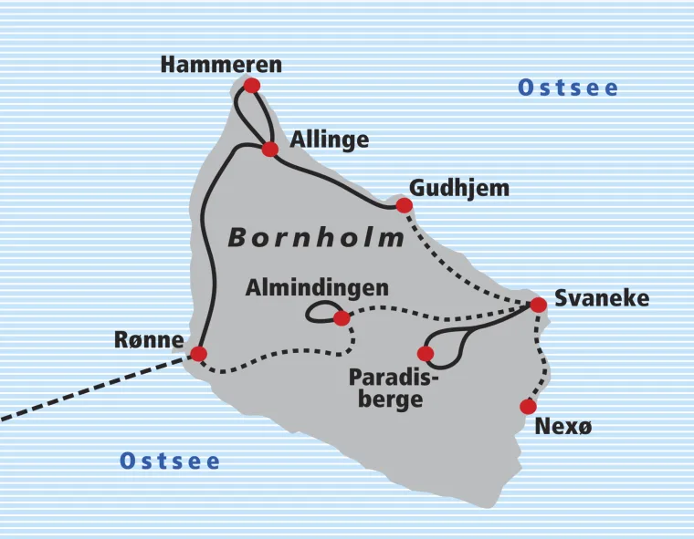 Individuelle Anreise nach Rügen zum Fährhafen Sassnitz/Mukran. Sie gehen als Fussgänger mit Ihrem Gepäck auf die Fähre. Nach ca. 3½ Std. Fährfahrt (im Arrangement inbegriffen) erreichen Sie Bornholms Hauptstadt Rønne. Gepäckübernahme und Toureninformation durch unseren Gästebetreuer an der Fähre.