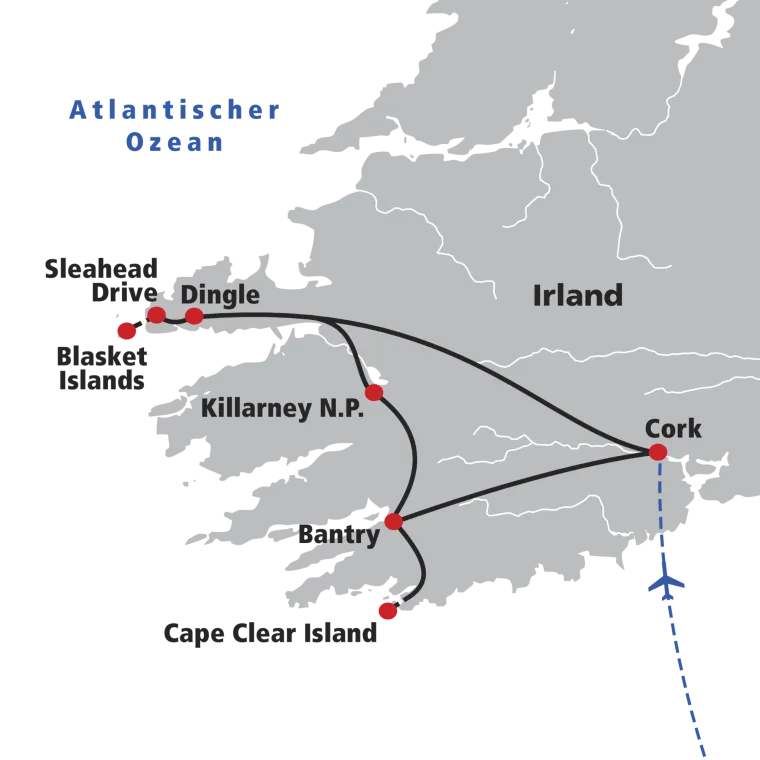 Unsere Fahrt auf die Dingle-Halbinsel, die von National Geographic als „der schönste Ort der Welt“ bezeichnet worden ist, bringt uns durch die idyllische Berg- und Seenlandschaft des Nationalparks von Killarney. Auf der Iveragh Halbinsel türmen sich mit den Macgillycuddy’s Reeks die höchsten Berge Irlands. Wir wandern im Eichenwald und lassen uns verzaubern. → Wz 2½ - 3 Std.
