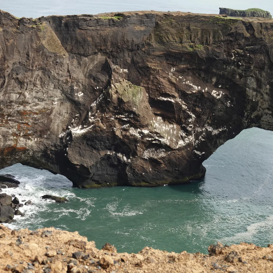 Wir wandern entlang der Küste, unter uns schwarzer Strand. Die klatschenden Wellen des Atlantiks nur von den Rufen der Seevögel unterbrochen. Beeindruckende Felsformationen, darunter die berühmten Basaltsäulen Reynisdranger, ragen aus dem Meer. Der Pfad führt weiter bis zum südlichsten Punkt Island, dem Kap Dyrhólaey. Wir geniessen die grossartige Aussicht.→ Wz 3 Std.