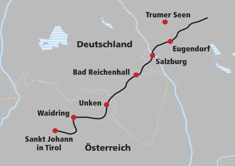 Hinaus aus der Stadt führt Ihre Wanderung in Richtung Untersberg. Bei Schloss Marzoll überschreiten Sie die Grenze zum bayrischen Rupertiwinkl, bevor Sie anschliessend in die sehenswerte Salzmetropole Bad Reichenhall kommen. Dort lockt die Entspannung im warmen Solewasser der Therme, ein Besuch im Kurpark und die Besichtigung der Alten Saline.