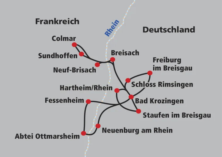Sie radeln gemütlich entlang des Rheins vorbei an Neuenburg zur Abtei Ottmarsheim ins Elsass. Die Schlussetappe beenden Sie über Fessenheim in Ihrem Hotel in Bad Krozingen und geniessen den letzten Abend Ihrer Velotour.