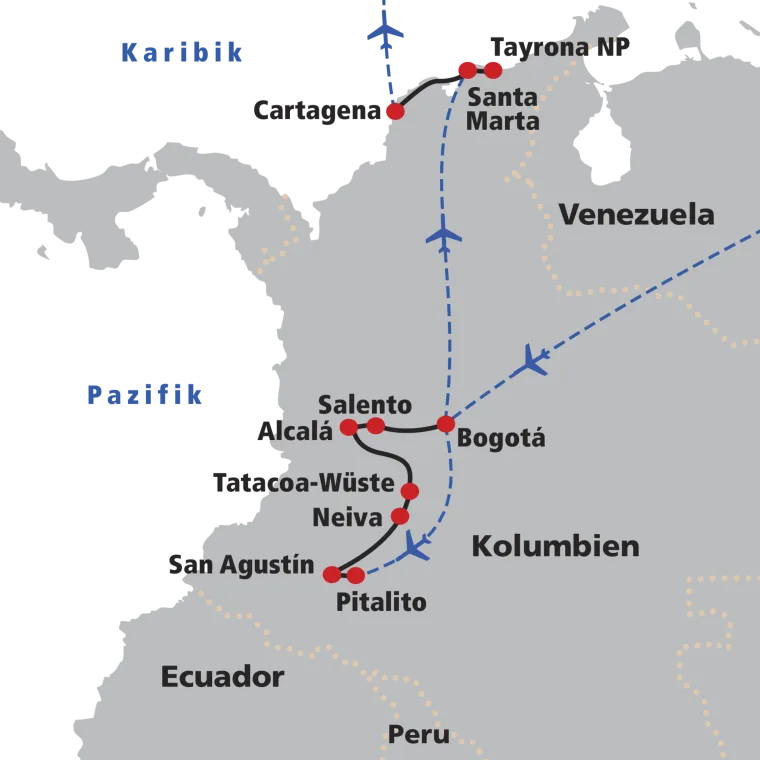 Flug nach Pitalito und Fahrt nach San Agustín, bekannt durch seine Kultstätten mit hunderten Skulpturen. Nachmittags wandern wir zu einem herrlichen Aussichtspunkt auf den Canyon der Magdalena. Der Rio Magdalena ist wichtigste Fluss des Landes, der sich hier beeindruckend seinen Weg durch eine 400 Meter tiefe Schlucht zwischen der Ost- und Zentralkordillere bahnt. → Wz 1 Std.