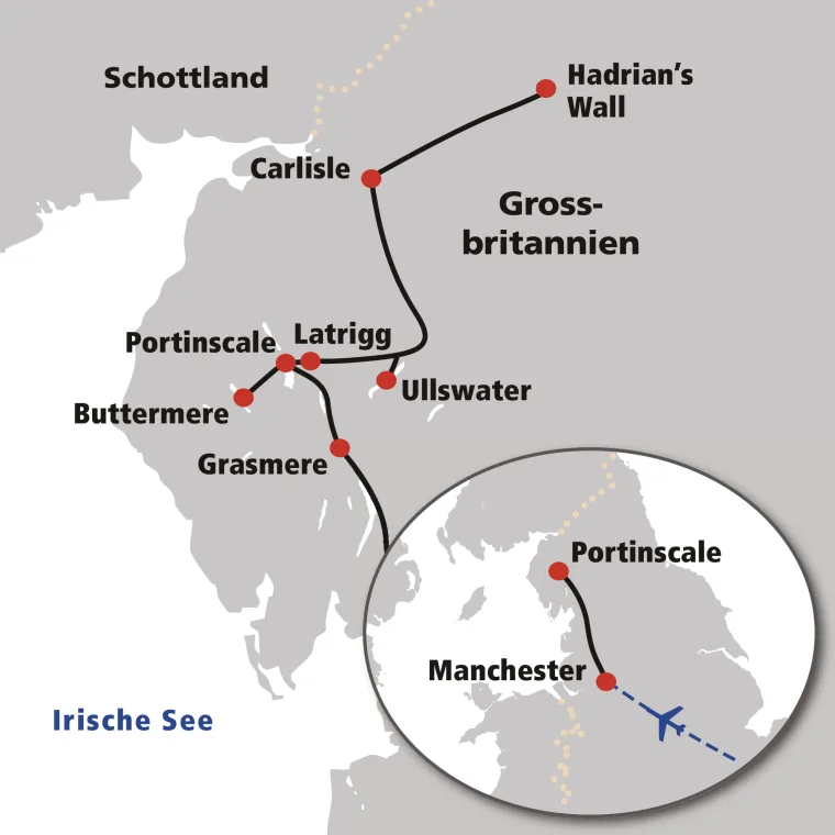 Flug nach Manchester. Den Bustransfer nach Portinscale unterbrechen wir bei Windermere für eine kleine Wanderung zum See School Knott Tarn.→ Wz 1½ Std.