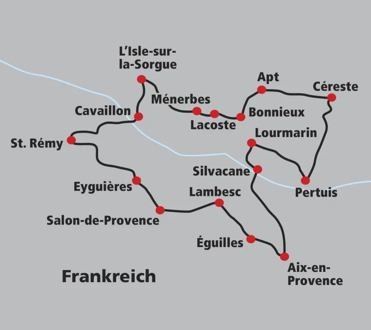 Von Aix-en-Provence aus führt die Reise nach Norden, in eine Region, in der die Provence ihre ganze Vielfalt und Farbenpracht entfaltet. Hier erstrecken sich sanfte Hügel, die mit Lavendelfelder bedeckt sind und die Strassen schlängeln sich durch malerische Dörfer. Bonnieux fasziniert mit seiner einmaligen Lage, die einen atemberaubenden Blick auf die umliegende Landschaft bietet. Lacoste beeindruckt mit dem Schloss des Marquis de Sade. Der charmante Ort St. Rémy wird Sie genauso begeistern wie damals van Gogh. Auch der moderne Schriftsteller Peter Mayle beschrieb die Landschaften und Menschen im Luberon mit grosser Zuneigung.