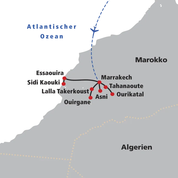 Wir verlassen Essaouira Richtung Atlasgebirge und wandern bei Azegour durch Terrassenfelder, Dörfer und Hügel mit weitem Ausblick. Am Nachmittag fahren wir weiter nach Marrakesch, wo ein feines marokkanisches Abendmenü den kontrastreichen Reisetag abrundet.→ Wz 2½ Std.