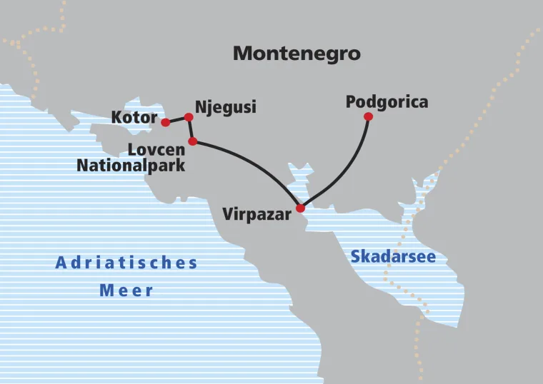 Die heutige Wanderung führt durch das Herz des Nationalparks hinauf zum Mausoleum von Petar Njegos, grösster Dichter und Fürst Montenegros. Ein Besuch ist empfohlen, denn man geniesst bei schönem Wetter eine wunderbare Aussicht auf fast ganz Montenegro! Im angeschlossenen Restaurant können Sie sich stärken, bevor Sie auf einem alten Militärpfad zum Dorf Njegusi absteigen. Njegusi ist heutzutage bekannt für seine Schinken- und Käseproduktion, aber es ist auch der Geburtsort von besagtem Dichter und Fürsten. Sie übernachten in einem gemütlichen Gasthof.