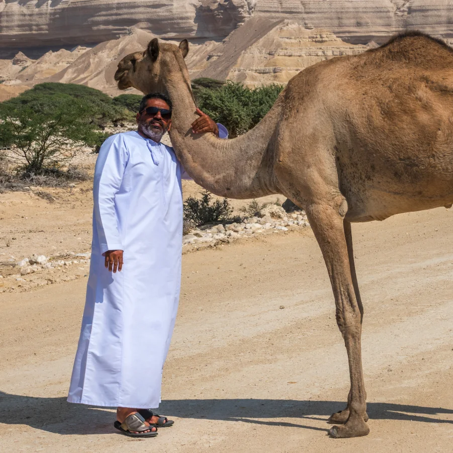 Ab heute folgen wir der grösstenteils touristisch unerschlossenen Küste zwischen Salalah und Muscat. Die Strasse windet sich dramatisch durch die Felsen auf das Plateau des Jebel Samhan: steile Klippen, tiefe Wadis und Ausblicke auf das Arabische Meer. Im Wadi Shuweymiyah wandern wir durch Kalksteinlandschaften. Wir schlagen unsere Zelte direkt am Strand auf.