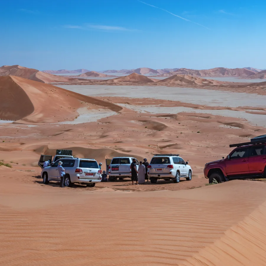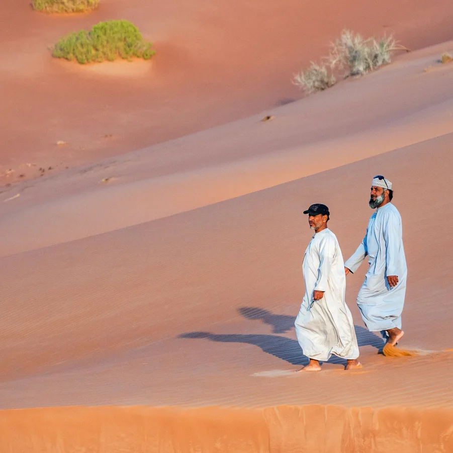 Nizwa war das Machtzentrum des Oman. Wir schlendern durch die Souqs, probieren Datteln und die omanische Süssigkeit «Halva». Von der Nizwa-Festung geniessen wir den Ausblick auf die Stadt, die Datteloase und das aride Gebirge. Danach fahren wir in Richtung Rub al «Khali»-Wüste, an den Rand des «Leeren Viertels».