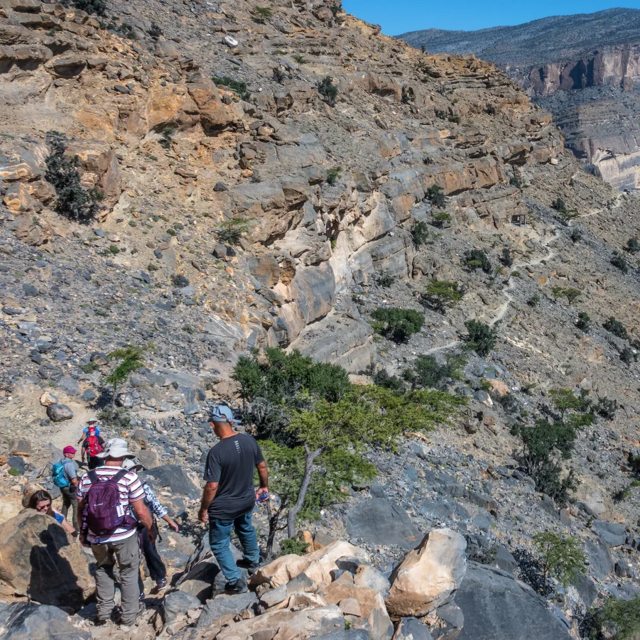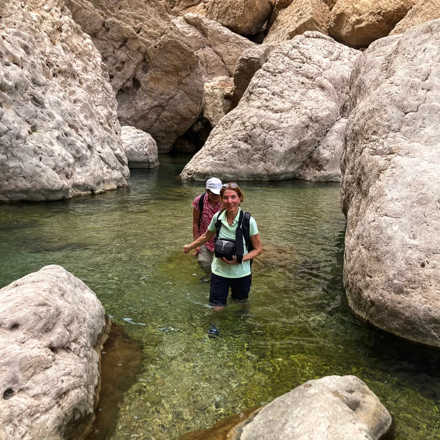 Zurück im Hajar-Gebirge! Noch einmal offroad hinauf auf knapp 2000 m zum Salmah-Plateau. Im abgelegenen Wadi Al Arbaeen wandern wir durch eindrucksvolle Felslandschaften bis zum ersten Wasserpool – ideal für ein erfrischendes Bad.