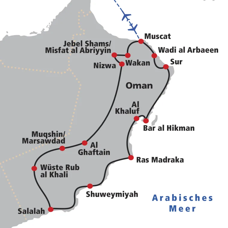 Via Wadi Mazara und Quriat Damm fahren wir zurück nach Muscat. Rückflug am Nachmittag in die Schweiz.