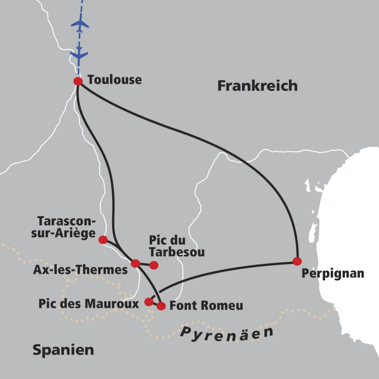 Im Herzen der Pyrenäen, im an Spanien angrenzende Département Ariège wandern wir über einen kleinen Pass vorbei an 4 authentischen und malerischen Dörfern. → Wz 3 ½ Std.