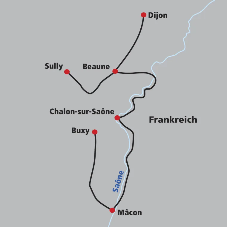 Unsere letzte Velotour beginnt in Beaune und führt uns hinaus aus den Weinbergen in die weiten Flusslandschaften östlich der Côte d’Or. Bald erreichen wir die Saône, der wir auf einem idyllischen Radweg folgen. In Verdun-sur-le-Doubs, ein malerisches Städtchen wo der Doubs in die Saône mündet, machen wir Halt. Entlang des Flusses fahren wir weiter durch stille Auenlandschaften, bis wir in Chalon-sur-Saône ankommen. Die lebendige Stadt mit ihrer charmanten Altstadt und den Plätzen am Ufer bildet den stimmungsvollen Abschluss unserer Reise.