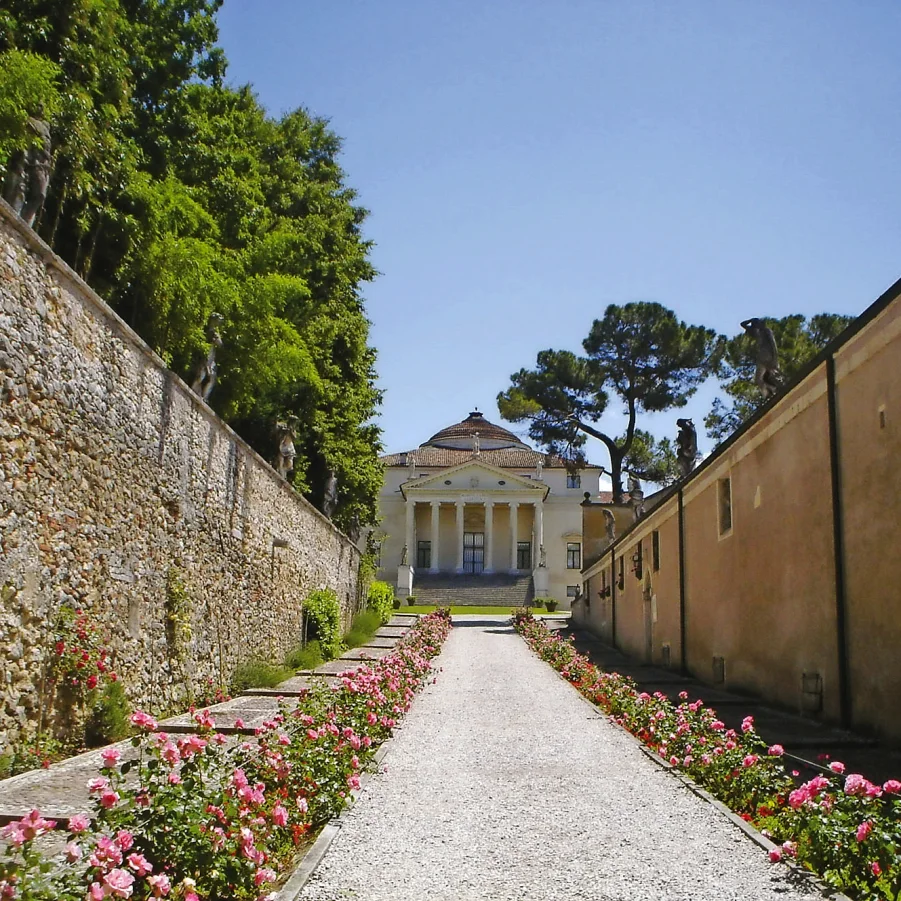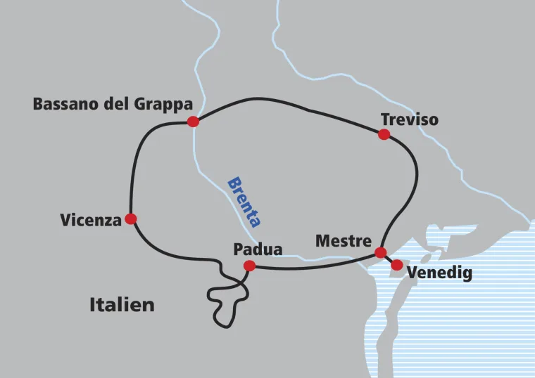 Von den Euganeischen Hügeln aus radeln Sie dem Fluss Bacchiglione entlang, der Sie nach Vicenza führt. Bevor Sie die Stadt erreichen, können Sie entlang des Radweges das palladianische Meisterwerk, die Villa La Rotonda bewundern. Lassen Sie sich von der Altstadt Vicenzas mit seinen wunderschönen Privatpalästen und der Basilika Palladiana verzaubern.