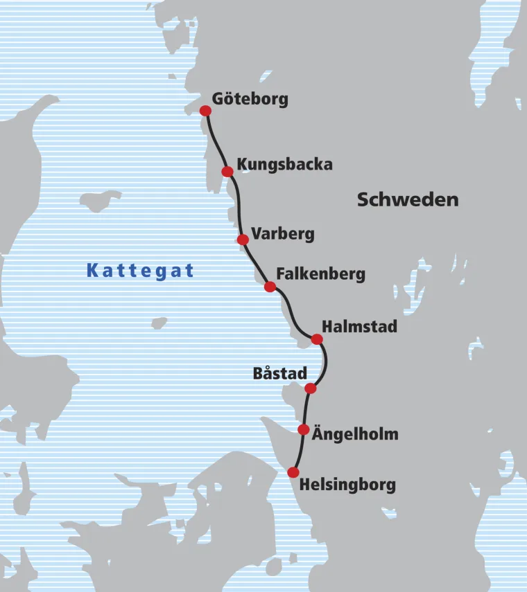 Von Ängelholm aus folgen Sie der Küste nach Vejbystrand, danach verlassen Sie die Küste und radeln quer über die Halbinsel und durch das Tal Sinarpsdalen in die schöne Sommerstadt Båstad. Entlang einem der längsten Sandstrände Schwedens passieren Sie die Orte Skummeslövsstrand und Mellbystrand und fahren durch die Naturreservate Tönnrersa und Gullbranna bevor Sie schlussendlich in Halmstad ankommen.