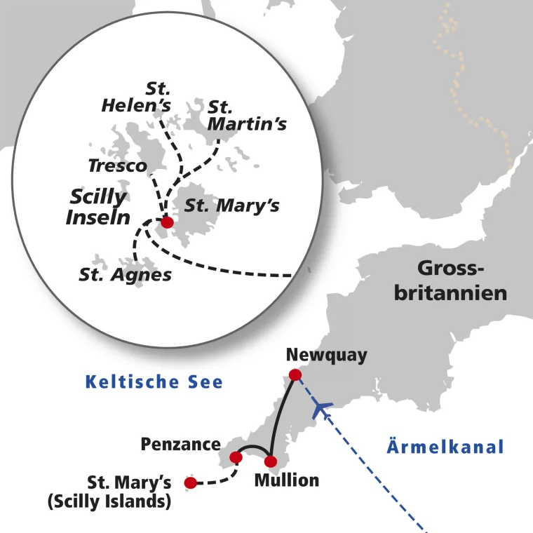 Nach einer knapp dreistündigen Fährüberfahrt durch die sanften Wellen des Atlantiks erreichen wir St. Mary’s – die grösste und zugleich lebendigste Insel des Scilly-Archipels. Bunte Fischerhäuschen, blühende Gärten und das entspannte Inselleben heissen uns willkommen. Je nach Ankunftszeit unternehmen wir einen gemütlichen Spaziergang entlang der historischen Garnison, die majestätisch über der Küste thront und einst als Verteidigungsanlage diente. Im Anschluss besuchen wir das liebevoll gestaltete Inselmuseum, das mit faszinierenden Ausstellungsstücken und Geschichten einen lebendigen Einblick in die bewegte Vergangenheit der Scilly-Inseln gewährt. → Wz 1 Std.