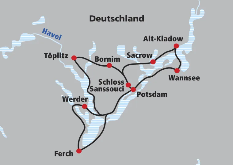 Entlang des Templiner Sees zur Inselstadt Werder. Vorbei am Schloss Petzow und Ferch (Strandbad) nach Caputh. Per Fähre (circa € 1,50 vor Ort) nach Geltow und zurück.