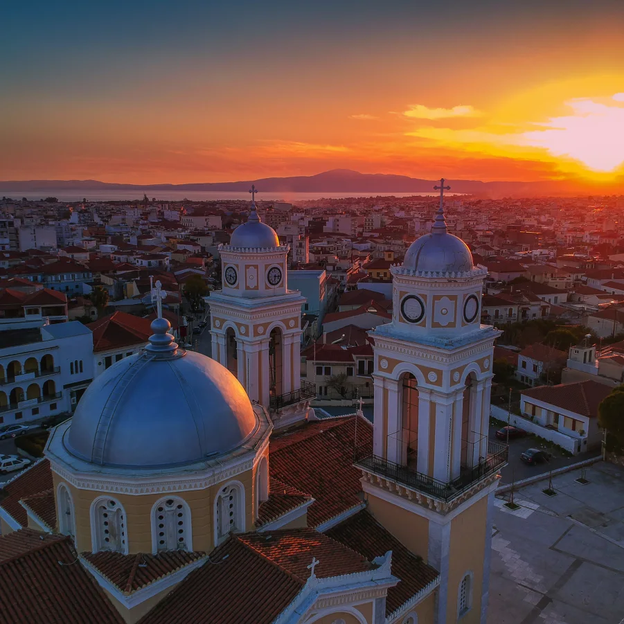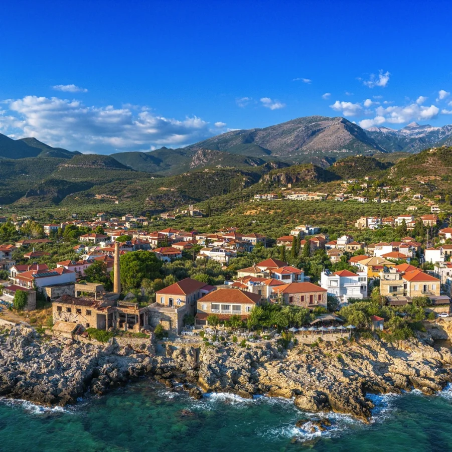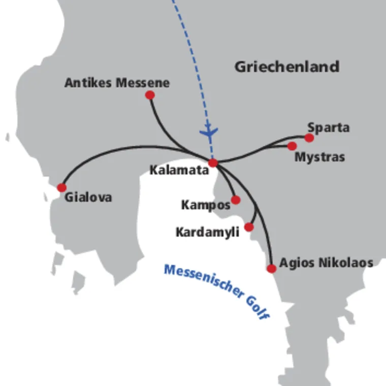 Direktflug nach Kalamata. Die lebendige Küstenstadt ist bekannt für ihre aromatischen Kalamata-Oliven und die spektakuläre Bergkulisse des Taygetos-Gebirge.