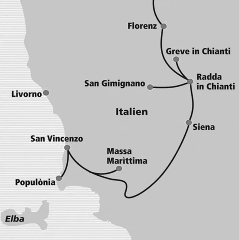 Der Küste entlang, immer mit Blick zur Insel Elba, dann aufwärts durch dichte Macchia führt uns unser Weg zum Städtchen Populonia, welches von seinen gut erhaltenen Stadtmauern umgeben und von weitem durch den imposanten Wachturm sichtbar ist. Der herrlich weisse Sandstrand lädt zum Verweilen ein. Anschliessend besichtigen wir die etruskische Nekropole Baratti mit seinen eindrücklichen, freistehenden Höhlengräbern und dem tiefblauen Meer im Hintergrund. → Wz 3 Std. / Besichtigung 1½ Std.