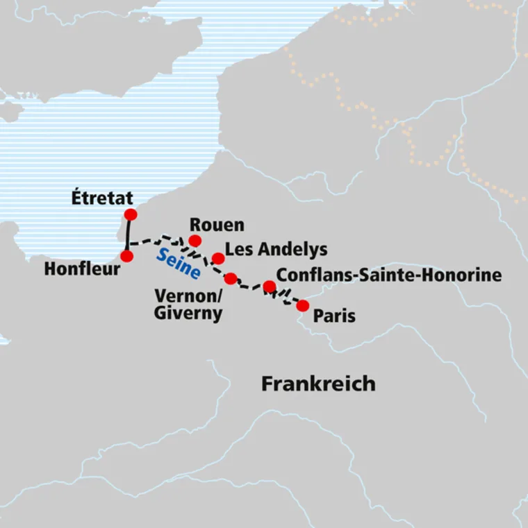 Auf unserer Reise in die Normandie und zurück, finden wir immer wieder schöne Malplätze, pittoreske Häuserzeilen und schmucke Altstadthäuser zum Zeichnen. Wir besuchen Auvers-sur-Oise, die kleine Ortschaft, in welcher der Maler Vincent Van Gogh seine letzten Spuren hinterlassen hat. In Conflans erklimmen wir die steilen Treppen bis zum Schifffahrtsmuseum und zeichnen in der schönen Parkanlage auf dem Hügel. Am dritten Tag erreichen wir Rouen, Hauptstadt der Normandie. Die Stadt ist bekannt für Jeanne d’Arc, seine gotische Kathedrale und die hübschen Fachwerkhäuser in der Altstadt. Wir erkunden die geschichtsträchtige Stadt zu Fuss und finden einen schönen Malplatz in der malerischen Altstadt. Ganz im Norden angekommen, besuchen wir Honfleur, die kleine Perle in der Normandie mit dem hübschen Hafen und den gemütlichen Restaurants. In Etretat treffen wir auf imposante Felsformationen der Alabasterküste. Auf dem Rückweg unserer Flusskreuzfahrt besuchen wir den Garten von Claude Monet in Giverny mit dem berühmten Seerosenteich. Auf der Rundfahrt in Paris mit dem Bateaubus gewinnen wir einen Eindruck dieser imposanten Stadt. Bei der Notre Dame steigen wir aus und zeichnen unsere letzten Skizzen.