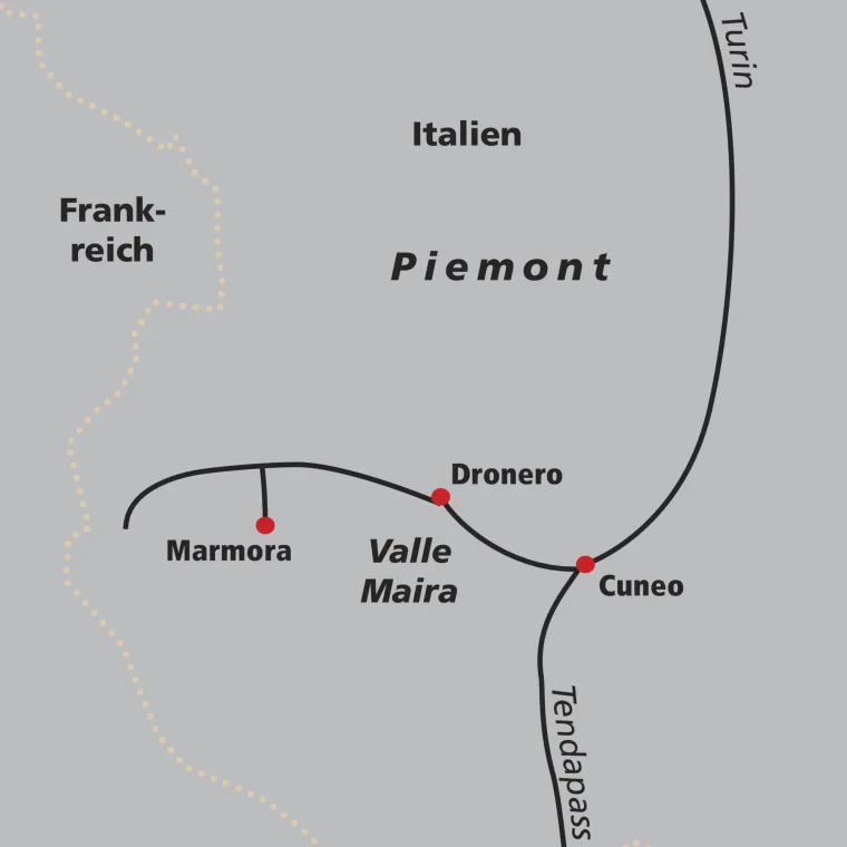 Bahnfahrt 1./2. Klasse von Zürich via Turin nach Cuneo. Bustransfer ins Valle Maira.