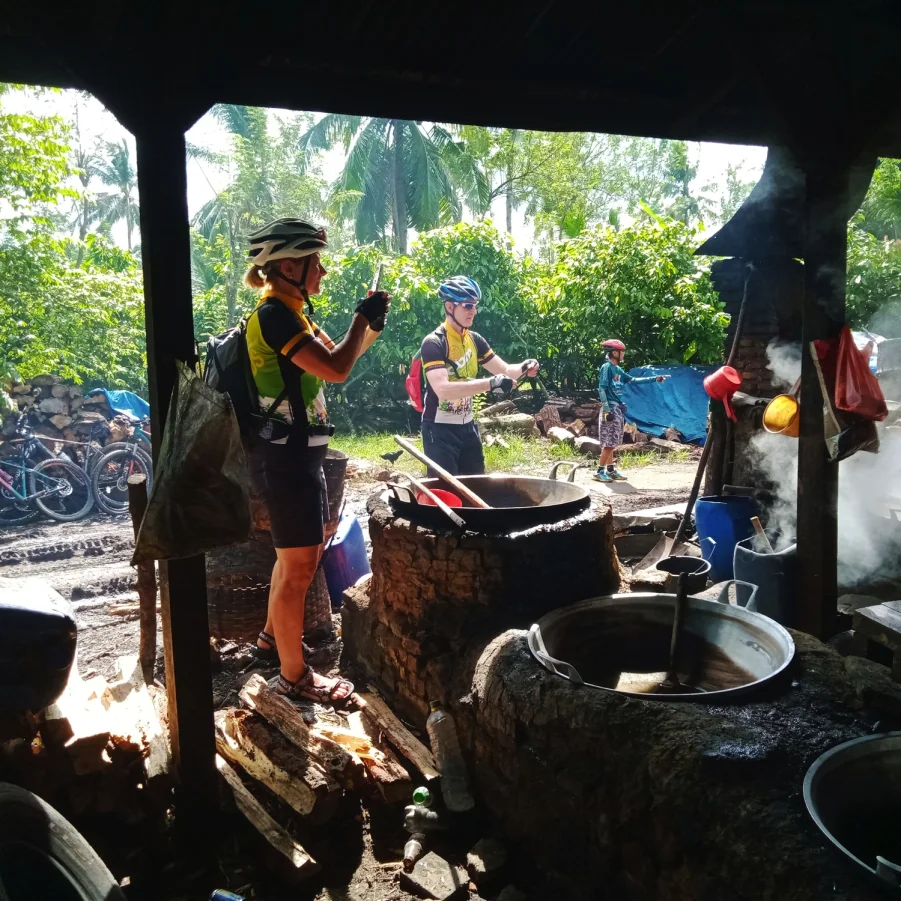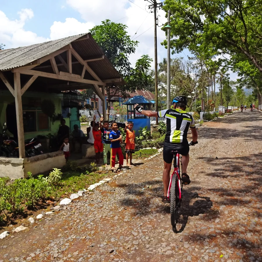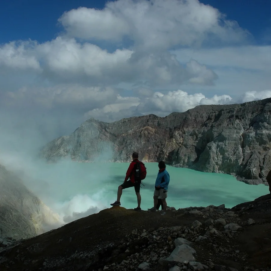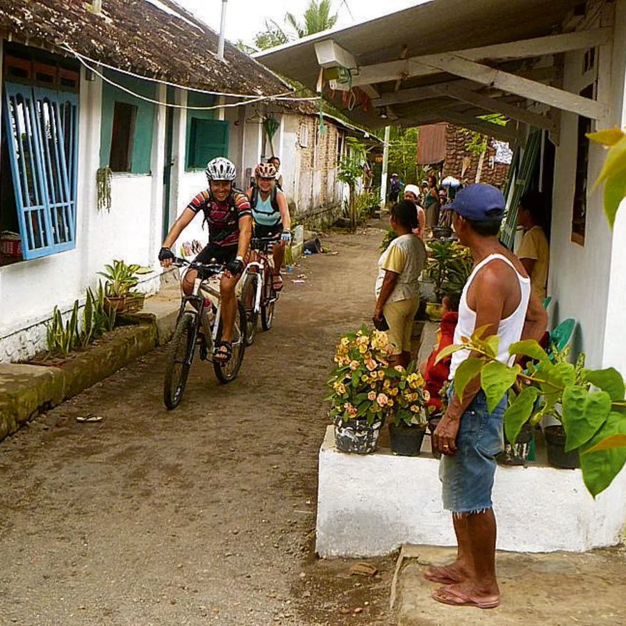 Zerrissene Dampfschwaden kräuseln sich gespenstisch auf einer grünlichen Wasserfläche. Bei Sonnenaufgang hat man den Eindruck, vor dem gigantischen Giftkessel einer überdimensionalen Hexenküche zu stehen. Wer dies erleben will, muss bei Dämmerung die 400 Höhenmeter vom Camp bis zum Kraterrand mit oder ohne Bike in Angriff nehmen! Oben angekommen (2280m) haben wir eine unbeschreibliche Aussicht auf die nahen Vulkane Raung (3332m) und Semeru (3676m), die wir genießen, bevor wir per Rad die faszinierende Abfahrt erleben und nichts anderes als der Ozean soll unser Ziel sein! Nicht weniger als 35 km Abfahrt durch Urwald, Kokos- und Kaffeeplantagen! Zwischenstation ist ein klarer Naturpool in der Nähe eines Wasserfalles inmitten einer tropischen Landschaft, wie geschaffen um ein kühles Bad zu nehmen. Erfrischt und gestärkt können wir mit den Javanern auf dem Markt in Banyu noch einige Geschäfte machen, bevor wir mit dem Kleinbus zum Hotel fahren. → 35 km
