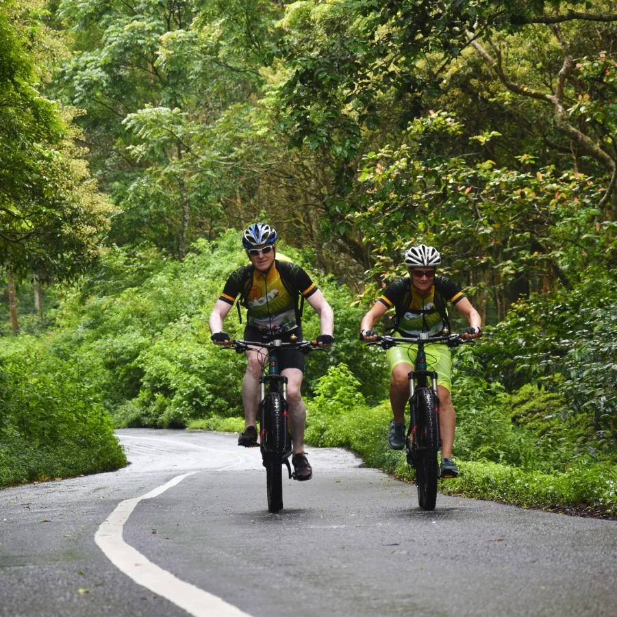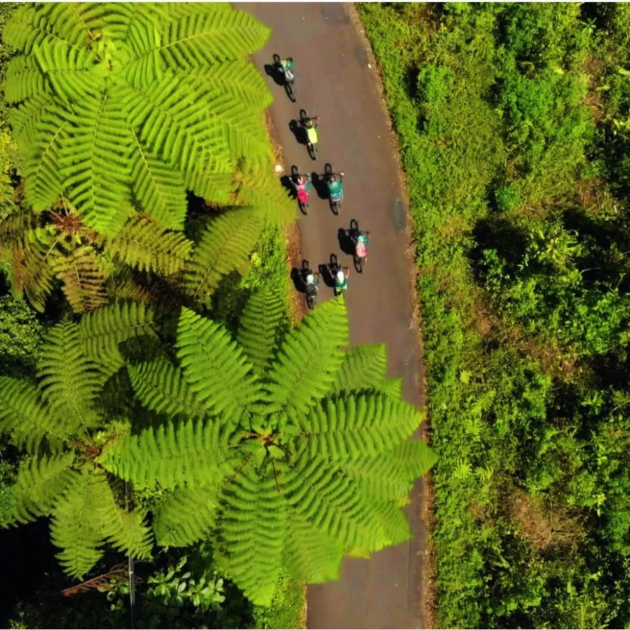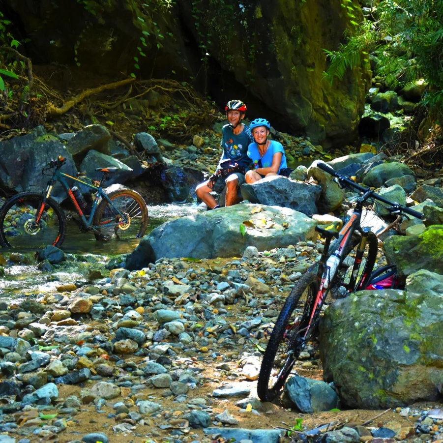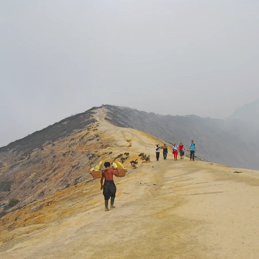 Zerrissene Dampfschwaden kräuseln sich gespenstisch auf einer grünlichen Wasserfläche. Bei Sonnenaufgang hat man den Eindruck, vor dem gigantischen Giftkessel einer überdimensionalen Hexenküche zu stehen. Wer dies erleben will, muss bei Dämmerung die 400 Höhenmeter vom Camp bis zum Kraterrand mit oder ohne Bike in Angriff nehmen! Oben angekommen (2280m) haben wir eine unbeschreibliche Aussicht auf die nahen Vulkane Raung (3332m) und Semeru (3676m), die wir genießen, bevor wir per Rad die faszinierende Abfahrt erleben und nichts anderes als der Ozean soll unser Ziel sein! Nicht weniger als 35 km Abfahrt durch Urwald, Kokos- und Kaffeeplantagen! Zwischenstation ist ein klarer Naturpool in der Nähe eines Wasserfalles inmitten einer tropischen Landschaft, wie geschaffen um ein kühles Bad zu nehmen. Erfrischt und gestärkt können wir mit den Javanern auf dem Markt in Banyu noch einige Geschäfte machen, bevor wir mit dem Kleinbus zum Hotel fahren. → 35 km