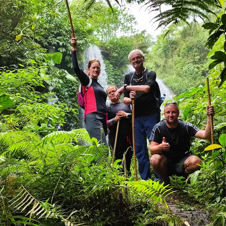 Um den strapazierten Sitzmuskeln die Gelegenheit der Entspannung zu geben, unternehmen wir heute eine Trekkingtour. Nach einer kurzen Busfahrt gehen wir zu Fuss durch Farmerland mit vielen exotischen Früchten, wie Tamarillo, Maracuja, Orangen, Mango und gelangen in eine Schlucht inmitten des Bergurwaldes. Es dauert nicht lange und das Kreischen der Vögel weicht dem Tosen der Wasserfälle. Nach dem Überqueren einer Bambusbrücke erreichen wir hinter dem Dickicht einen Wasserfall mit Naturpool. Eine super Gelegenheit die üppige Natur zu geniessen und ein kühles Bad zu nehmen… Hier gibt es zur Stärkung ein traditionelles "nasi campur" (gemischter Reis). Nur ein schmaler Pfad durch Dickicht und uralten Bäumen bringt uns dann zu einem tosenden Wasserfall, mit etwas Glück finden wir auch den berühmten „kopi luwak“ (Katzenkaffee). Nach dem Besuch einer kleinen Kaffeefarm legen wir die letzten Meter bis zum Hotel ohne grosse Anstrengung wieder per Bus zurück. Übernachtung im Hotel in Bedugul.→ Wz 7 km
