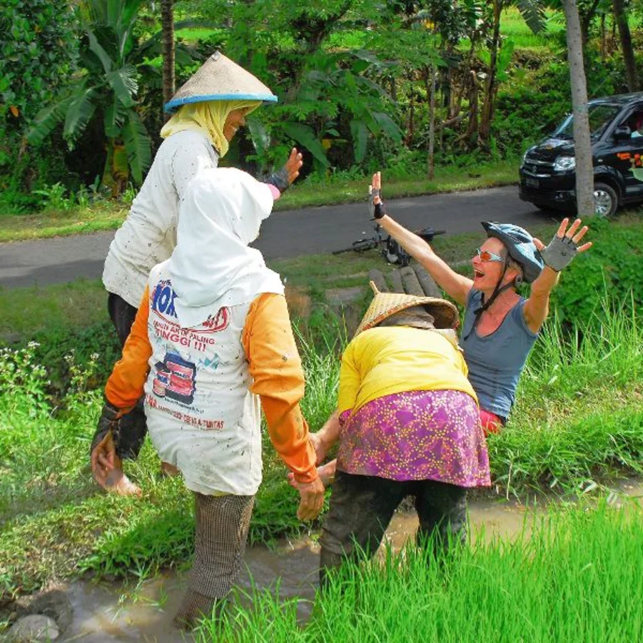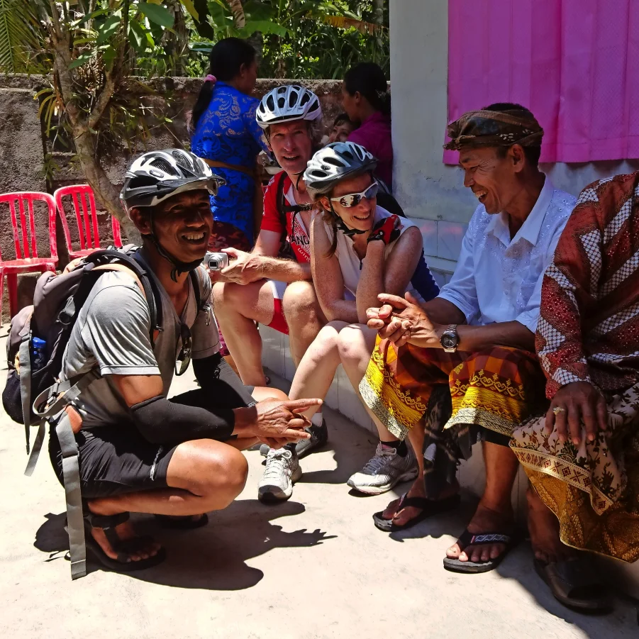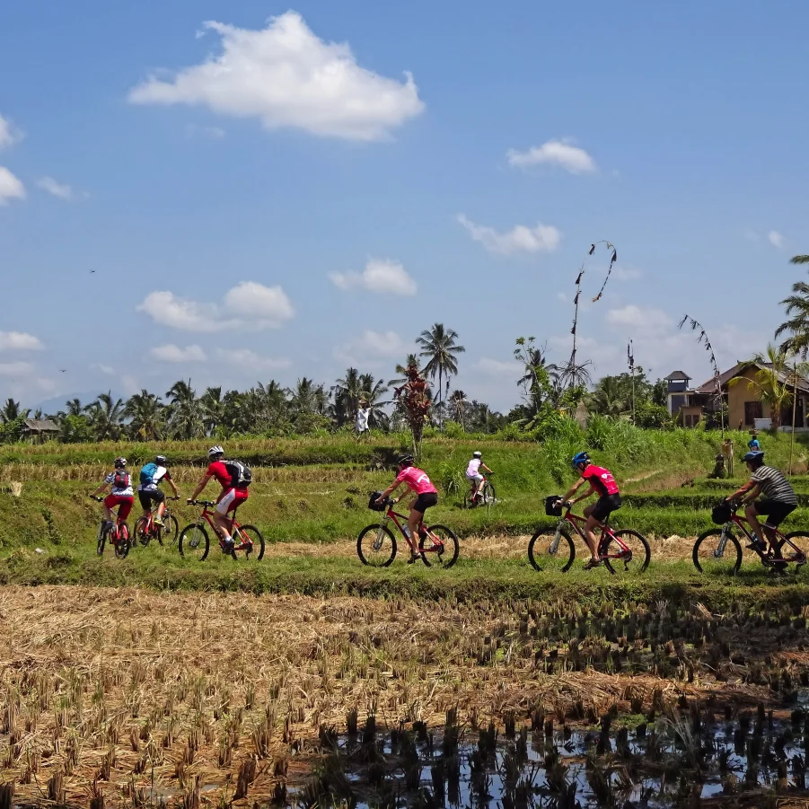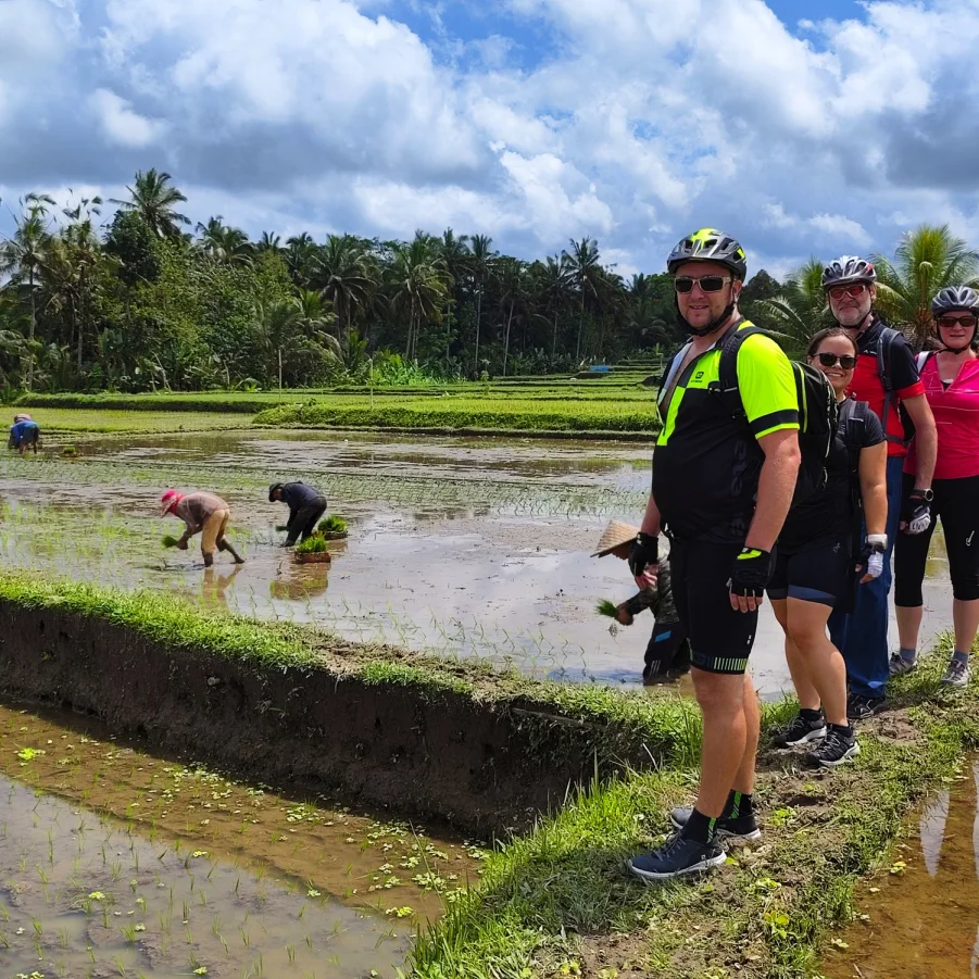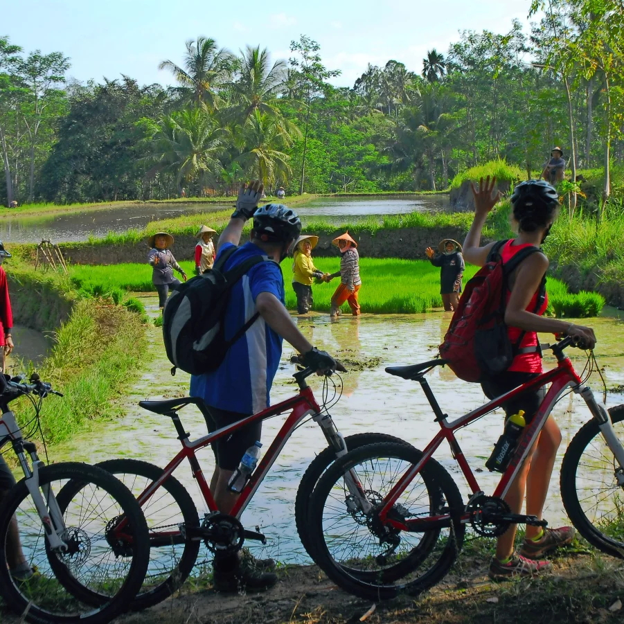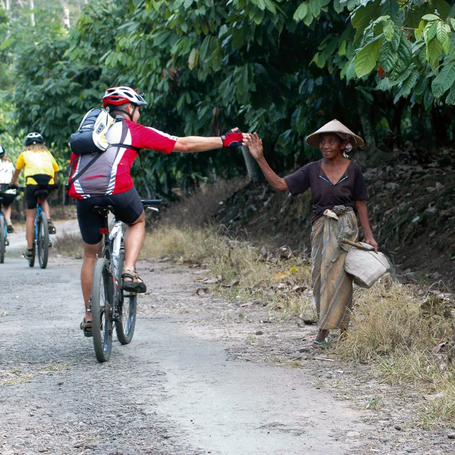 Auch heute wollen wir noch keine Cocos-Palmen aus der grünen Insel reissen, so belassen wir es bei einer schönen Velotour durch Reisfelder und traditionelle Dörfer. Unterwegs passieren wir die steilsten Reisterrassen der Insel Bali und besuchen eine Glasbläserei. Angekommen in der überwältigten Kulisse des Tempels Mengening dürfen wir im kristallklaren Holy Water ein Bad nehmen, bevor wir unseren traditionellen Lunch aus dem Bananenblatt verköstigen. Erfrischt und gestärkt rollen wir dann abwärts durch Reisfelder bis zu unserem Hotel nach Ubud. Nach diesem Ausflug stürzen wir uns wieder ins pralle Leben der Künstlerstadt Ubud. Der Abend steht wieder ganz im Zeichen der verrückten Stadt Ubud mit tollen Geschäften, einer Vielzahl an netten „Warungs“ (einfache Restaurants) und Restaurants. Wer für den nächsten Tag gerüstet sein will, kann schon mal eine „smooked“ duck (gebratene Ente) oder ein „babi guling“ (Spanferkel) bestellen. Übernachtung im Hotel in Ubud.→ 37 km
